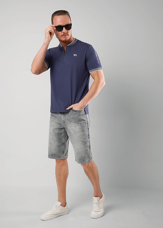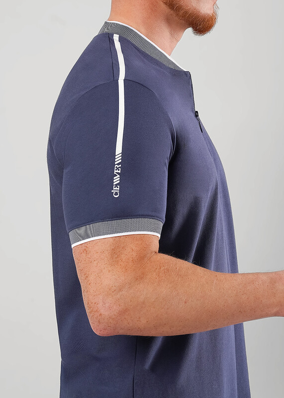 Модная мужская футболка из фактурного полотна ""пике"" с вязаными манжетами и воротником-стойка с застежкой молнией. Модель дополнена дизайнерским принтом. Подойдет на каждый день в сочетании с джинсами или брюками.