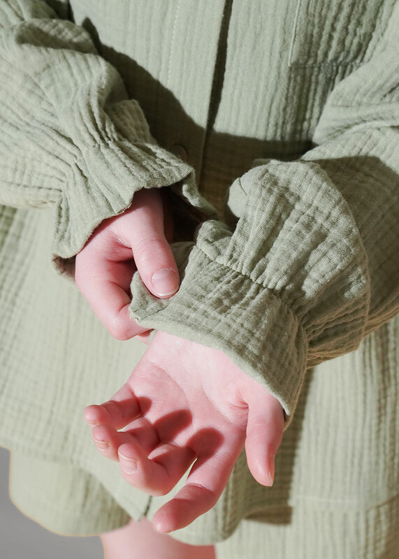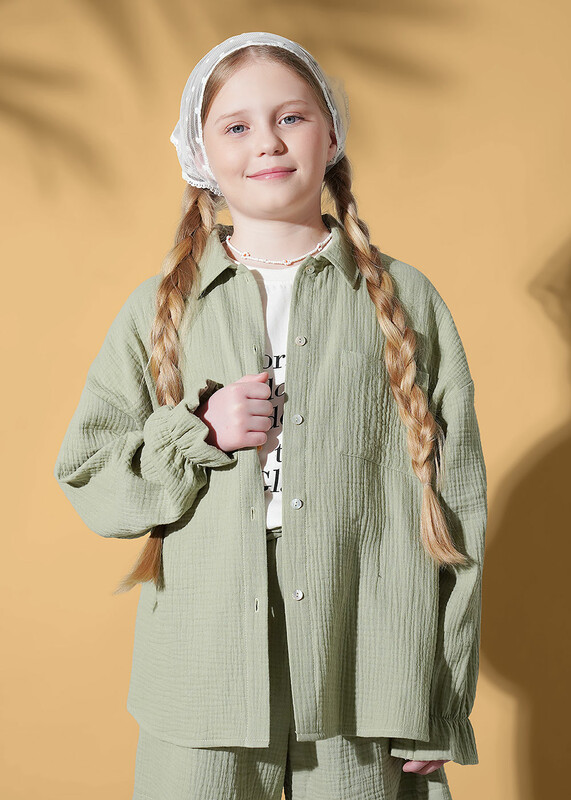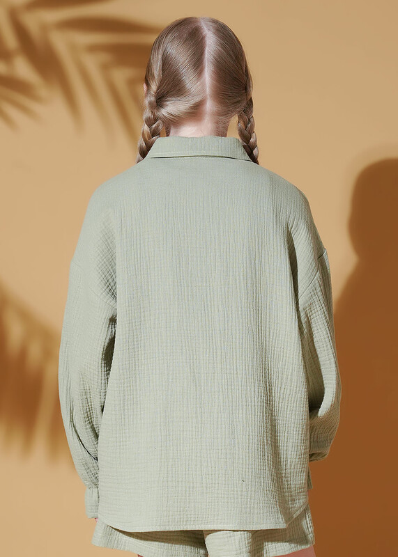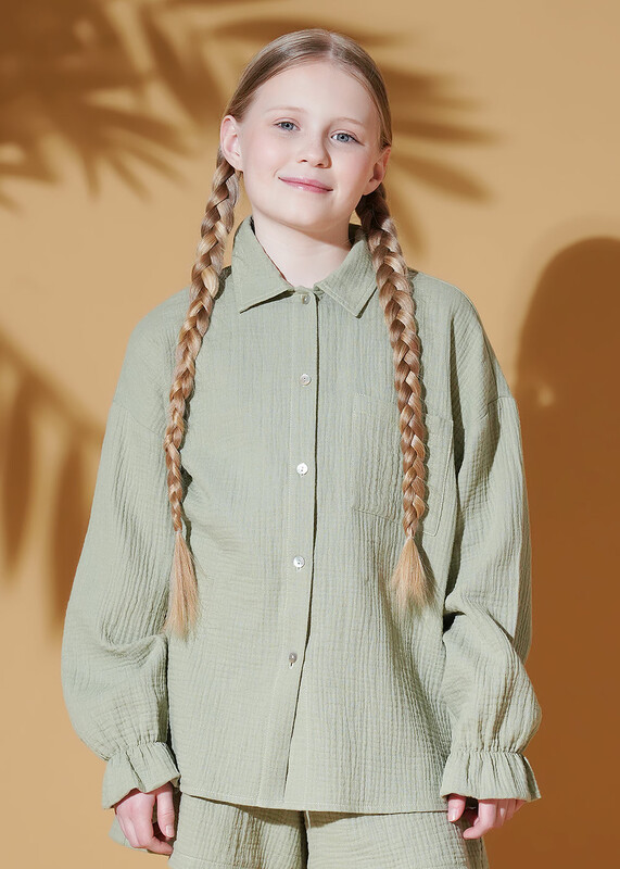 Лёгкая рубашка из нежного муслина для девочки — сочетание элегантности и комфорта. Отложной воротник придаёт изящества, рукава со сборкой на резинке, застёжка на пуговицы делает модель практичной. Представлена в стильных базовых оттенках: хаки и чёрном.