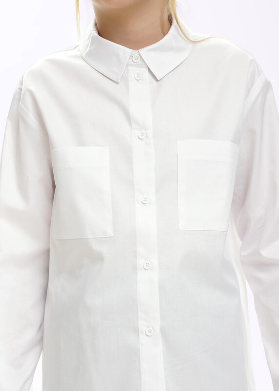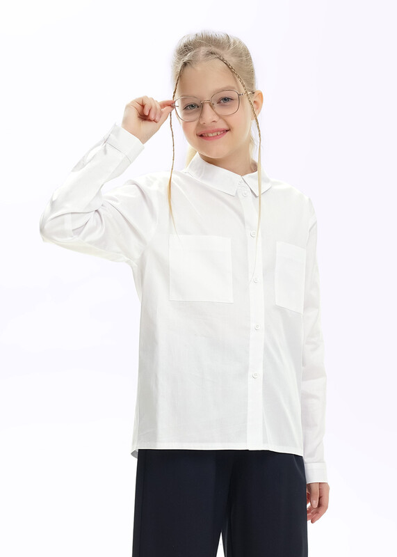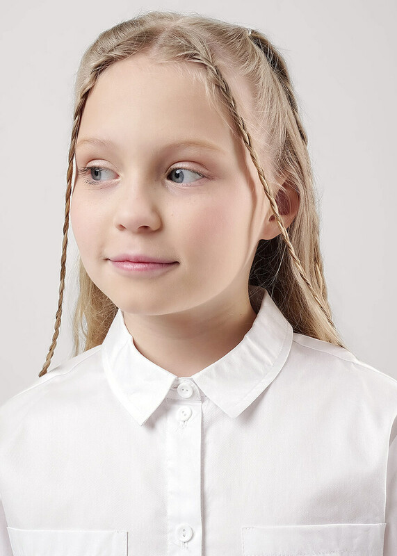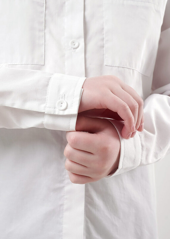 Базовая белая рубашка из поплина станет отличным дополнением к вашему гардеробу. Воротник со стойкой, планка и манжеты на пуговицах. Модель умеренного объёма дополнена накладными карманами. Рубашка идеально подойдёт для школьных и повседневных образов.