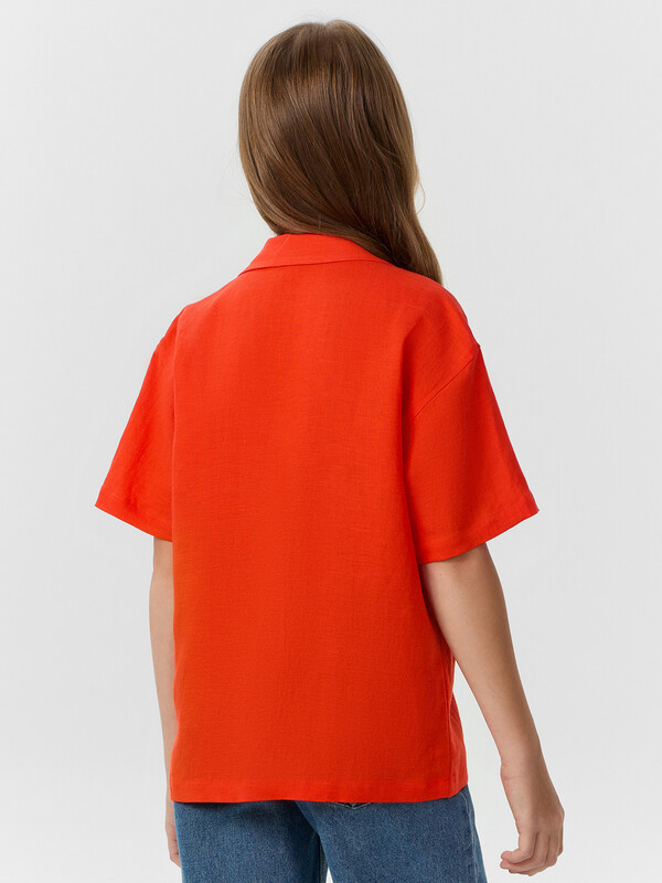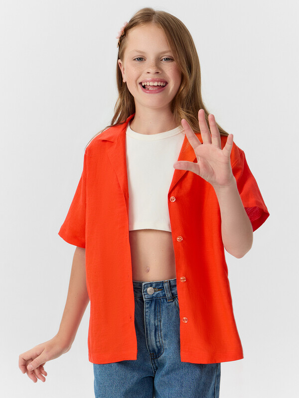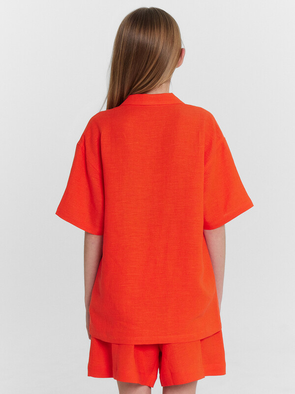 Блузка для девочек. свободного силуэта из ткани. По переду обработана застежка на пуговицы d=10mm и петли. Рукава короткие, втачные, слегка спущены. Нижние срезы изделия и рукавов обработаны швом в подгибку.