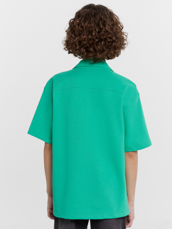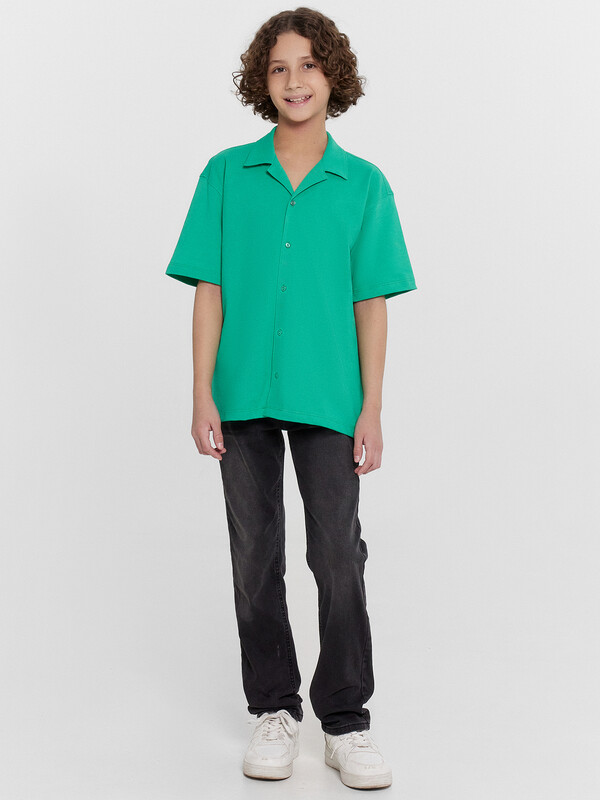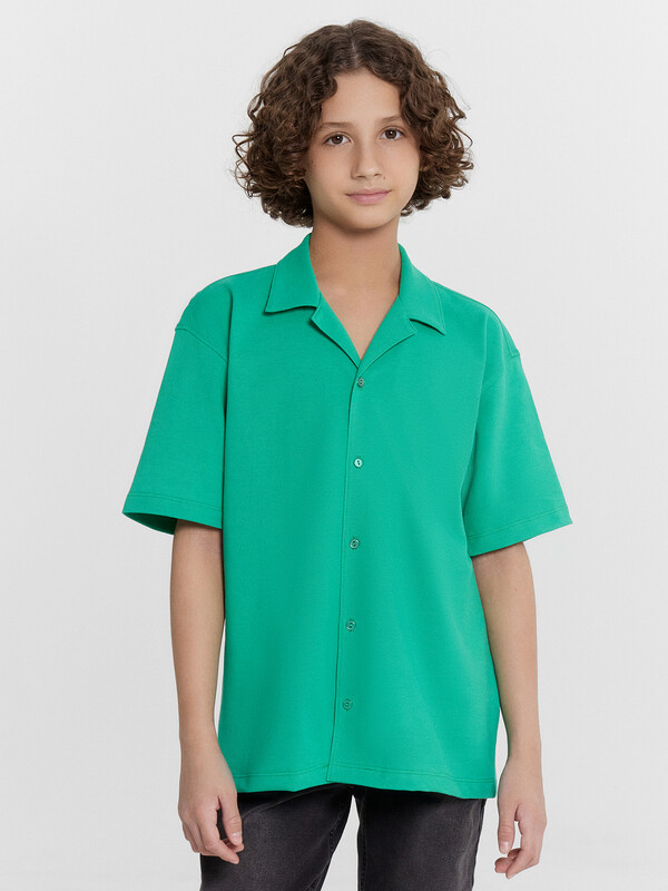 Сорочка верхняя для мальчиков прямого силуэта с воротником. По переду обработана застежка на пуговицы и петли. Диаметр пуговицы 1 см, 4 прокола. Рукава короткие, втачные, слегка спущены. На спине кокетка. Нижние срезы изделия и рукавов обработаны швом в подгибку.