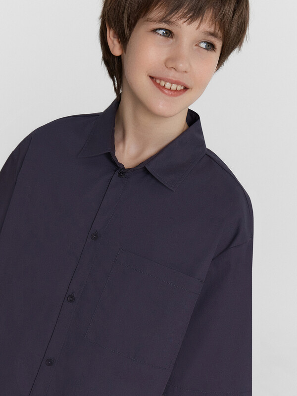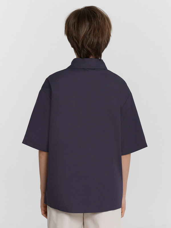 Рубашка для мальчиков прямого силуэта с воротником. По переду обработана застежка на пуговицу d=10mm и петли. На правой детали переда накладной карман. Рукава короткие, втачные, слегка спущены. Нижние срезы изделия и рукавов обработаны швом в подгибку.