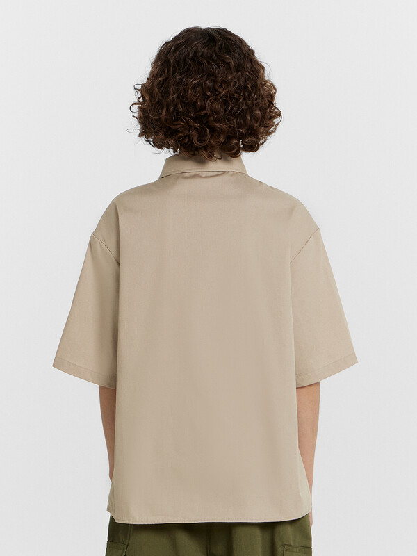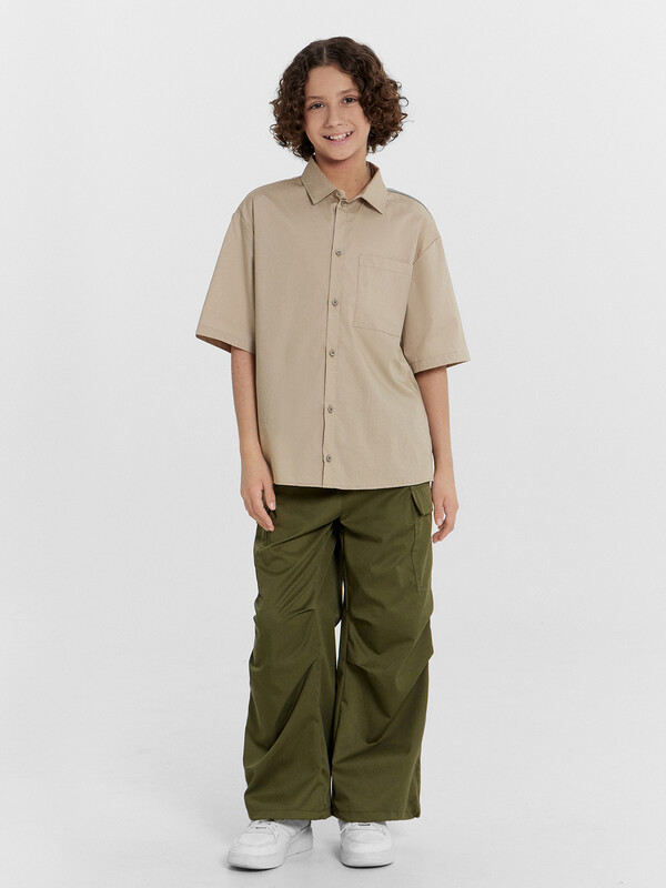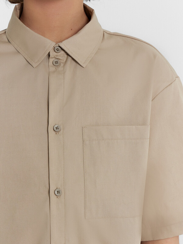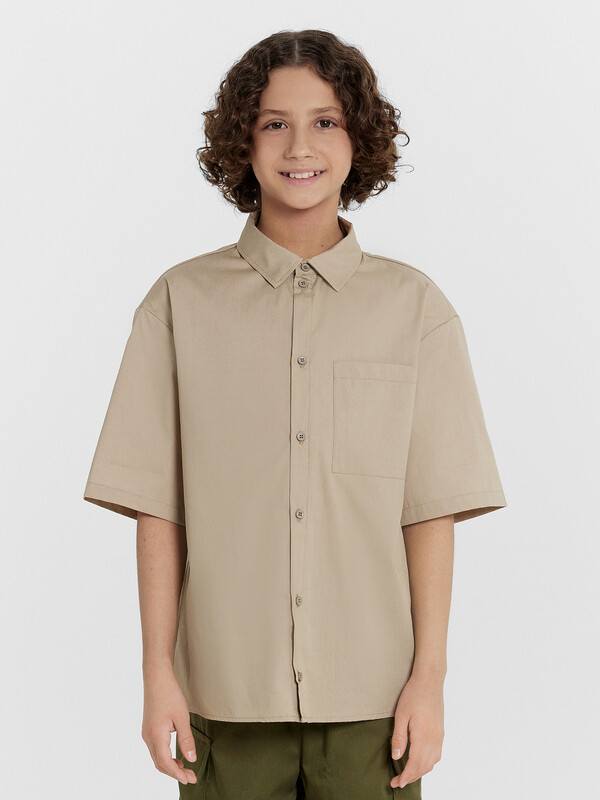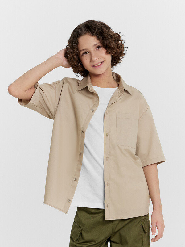 Рубашка для мальчиков прямого силуэта с воротником. По переду обработана застежка на пуговицу d=10mm и петли. На правой детали переда накладной карман. Рукава короткие, втачные, слегка спущены. Нижние срезы изделия и рукавов обработаны швом в подгибку.