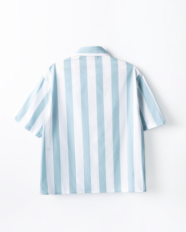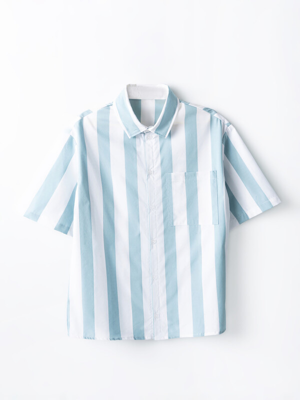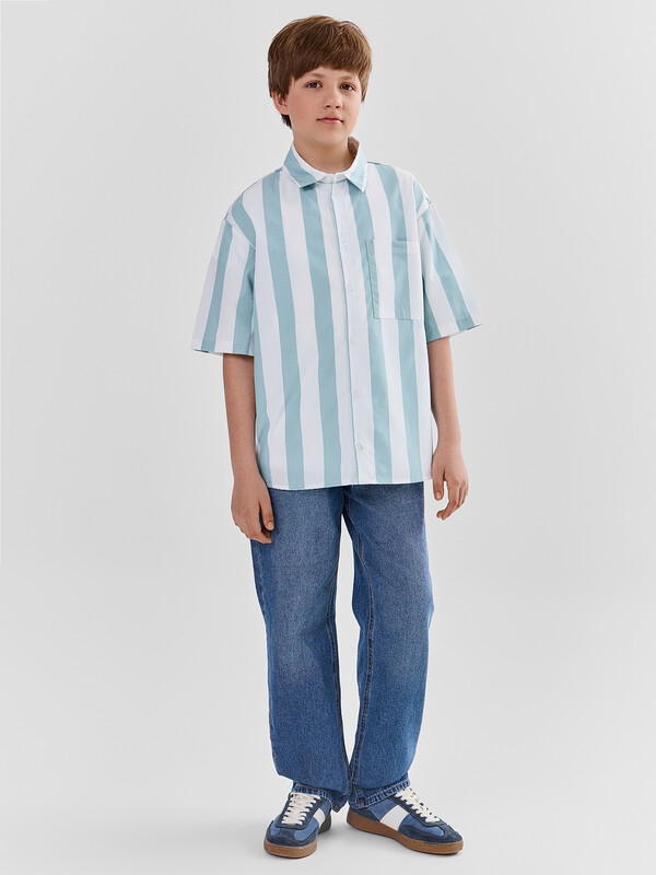 Рубашка для мальчиков прямого силуэта с воротником. По переду обработана застежка на пуговицу d=10mm и петли. На правой детали переда накладной карман. Рукава короткие, втачные, слегка спущены. Нижние срезы изделия и рукавов обработаны швом в подгибку.