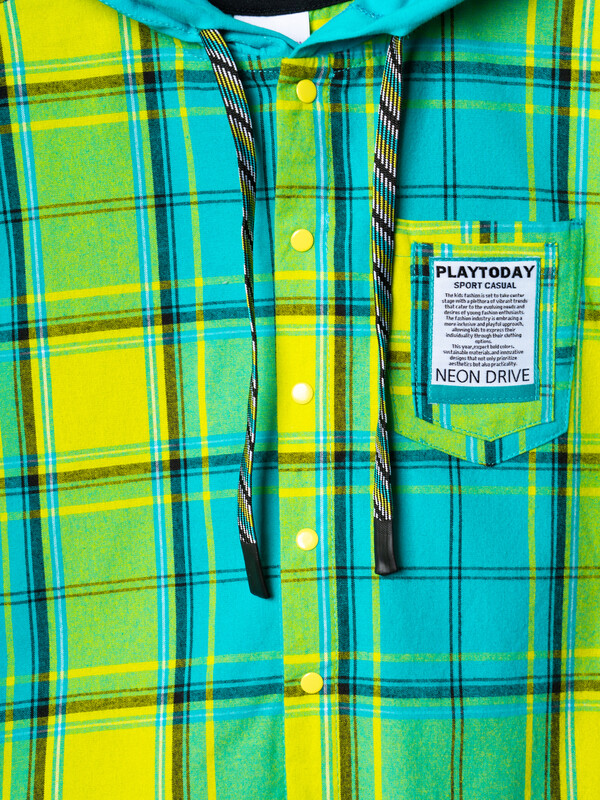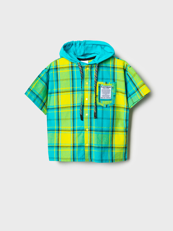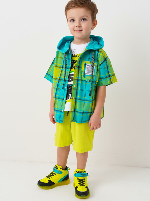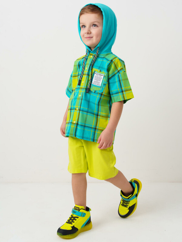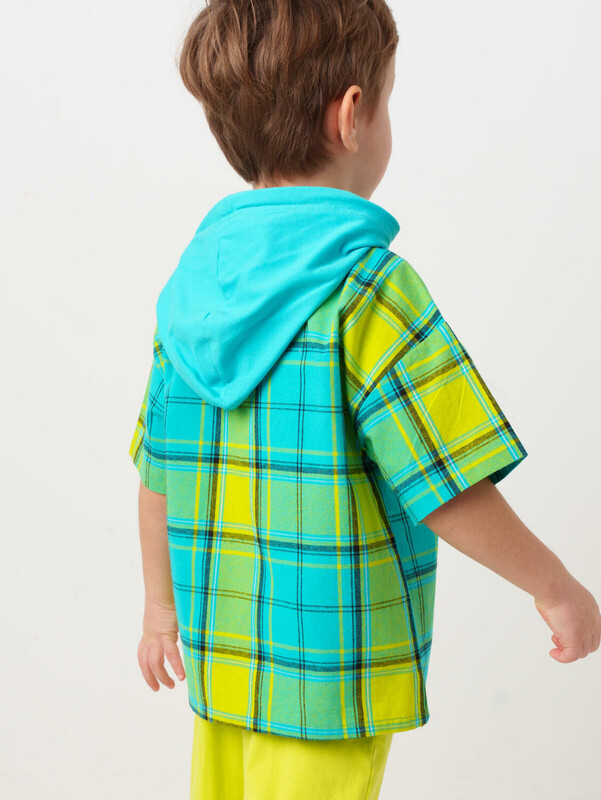 Детская рубашка с капюшоном для мальчика. Модель прямого кроя, с коротким рукавом. Выполнена из хлопковой ткани поплин. На груди расположен накладной карман. В капюшон вставлен декоративный шнур для регулировки. Застёжка на кнопки.