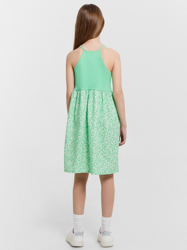 Сарафан отрезной по линии талии. Лиф из рибаны. Юбка расширенная со сборкой по талии. Низ изделия обработан швом в подгибку с закрытым срезом.
