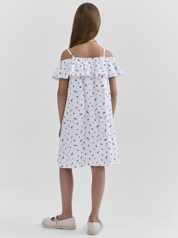 Сарафан А-силуэта на тонких бретелях. По плечевому поясу расположен декоративный волан со сборкой по верхнему срезу на эластичную тесьму. Низ изделия и низ волана обработаны на 2-х игольной плоскошовной машине швом в подгибку.