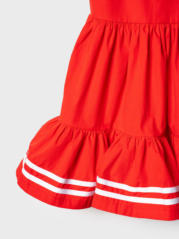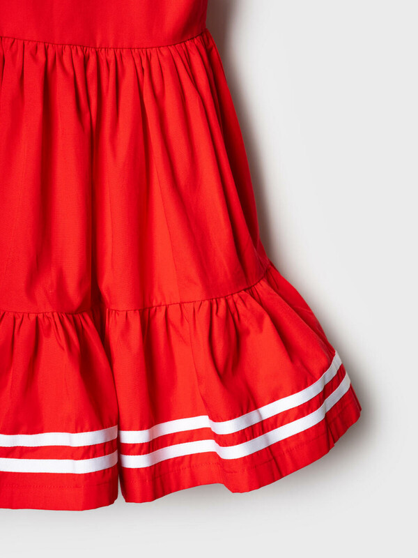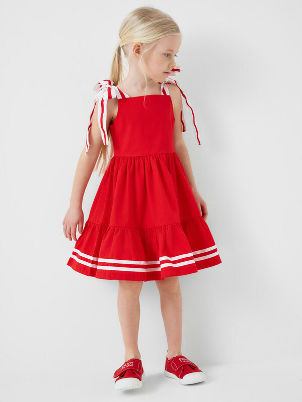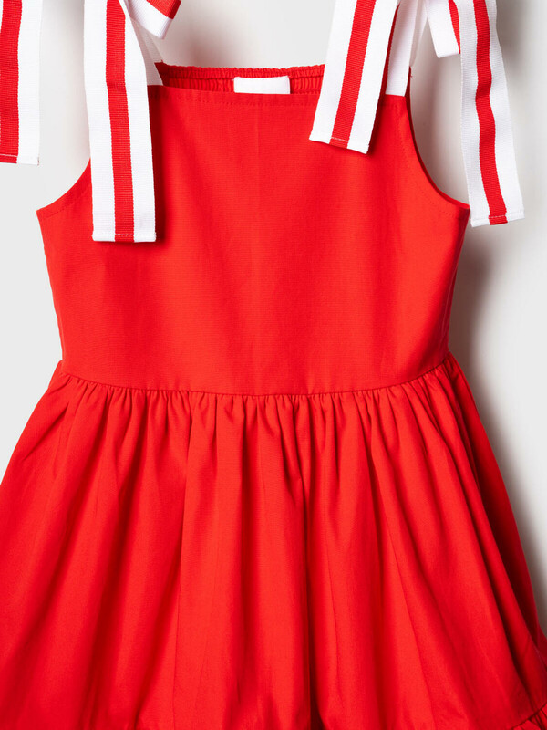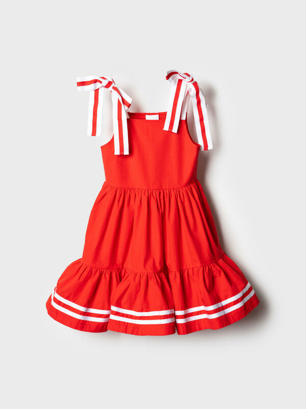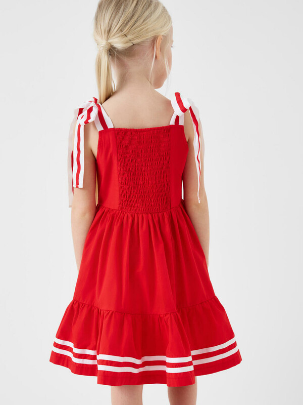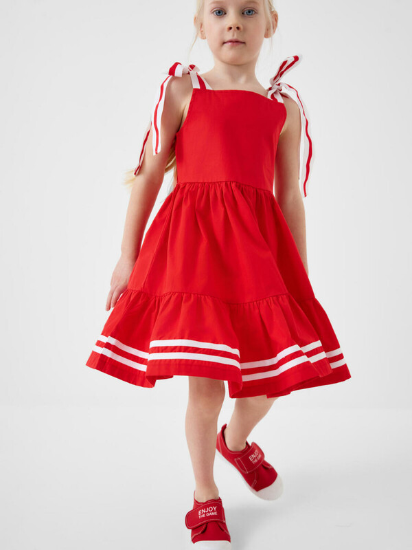 Детский сарафан для девочки. Выполнен из легкой хлопковой ткани поплин. Модель свободного кроя со сборкой на талии и широкими лямками, которые завязываются на плечах. На спинке — эластичная вставка, позволяющая изделию хорошо садиться по фигуре без застежек. Длина чуть выше колена.