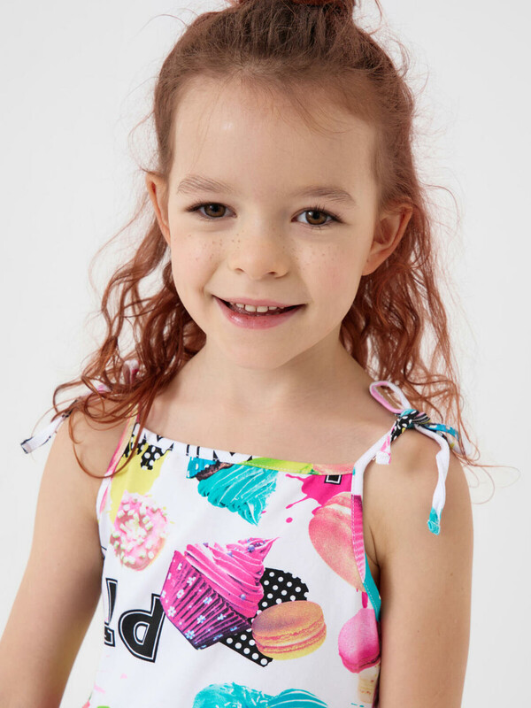 Яркий летний детский сарафан для девочки. Модель из мягкого хлопкового трикотажа джерси. Платье средней длины - чуть выше колена, с прямым силуэтом и широкой юбкой, создающей эффект лёгкости и объёма. Удобные тонкие бретельки завязываются на плечах в бантики. Основной акцент в дизайне — сочный многоцветный принт с десертами и сладостями: капкейки, конфеты, леденцы и надписи.