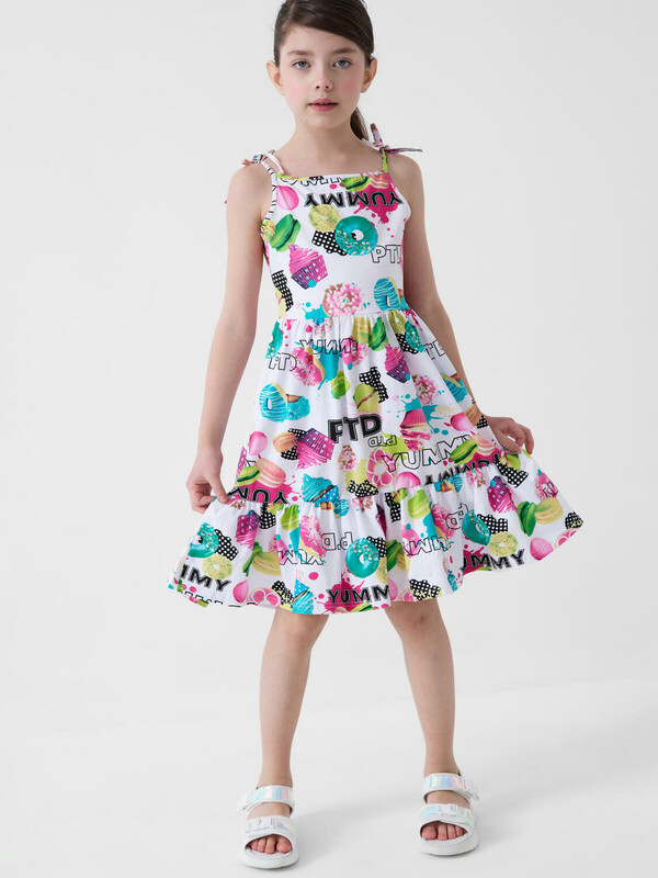 Летний сарафан для девочки подростка. Выполнен из мягкого хлопкового трикотажа джерси. Состоит из верха на тонких лямках, которые завязываются бантиками, и юбки с лёгкой сборкой. На ткани — красочный принт с изображениями пирожных, капкейков, макарунов и надписями, что делает модель весёлой и модной.