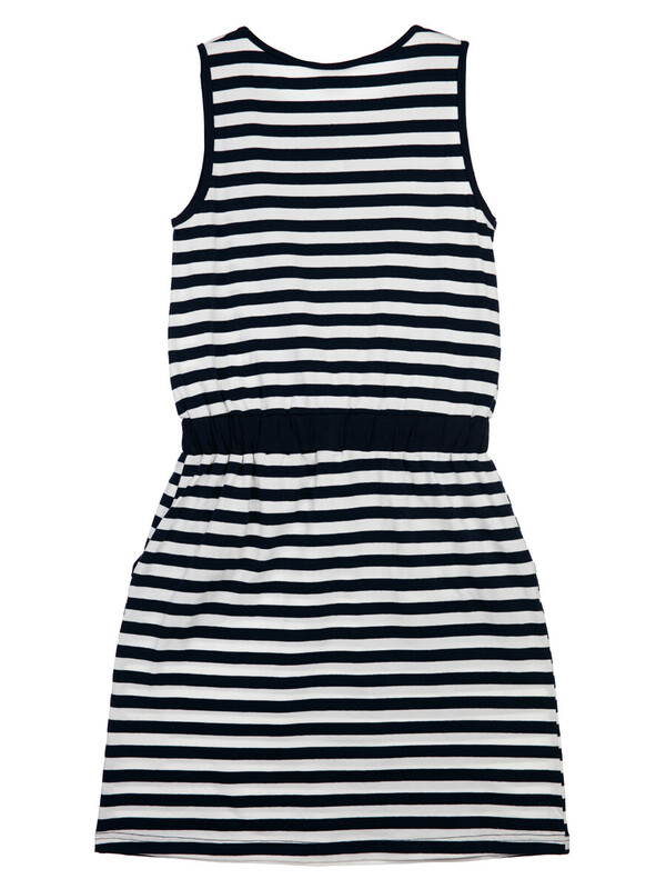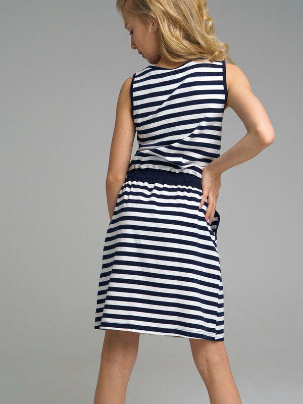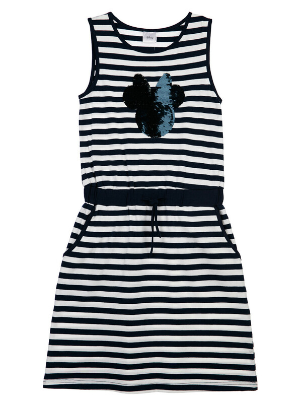 Сарафан с персонажем Disney из качественного и приятного на ощупь трикотажа джерси. Высокое содержание хлопка 95%. Благодаря наличию эластана в составе ткани, изделие проще в уходе и держит форму. Пояс со шнурком. Реверсивные пайетки. Карманы.