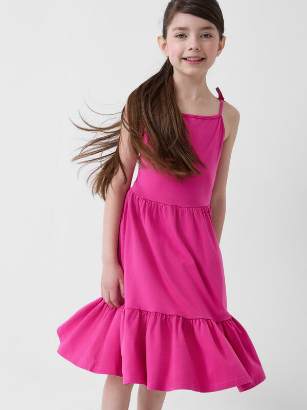 Лёгкий сарафан для девочки подростка. Модель из хлопкового трикотажа джерси, свободного кроя, длиной до колена, с ярусной юбкой на сборке, что добавляет объёма и легкости. Лиф с тонкими лямками, которые завязываются на плечах, создавая нежный акцент. На талии вшита силиконовая лента для лучшей посадки по фигуре.