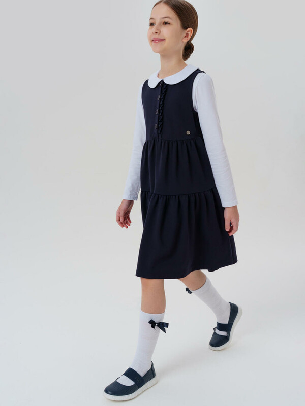 Совет по стилю: дополните нарядный трикотажный сарафан для школы белой блузкой, водолазкой и туфлями от PlayToday. В прохладную погоду сочетайте с жакетом, кардиганом или пиджаком бренда — получится аккуратный и завершённый школьный образ.