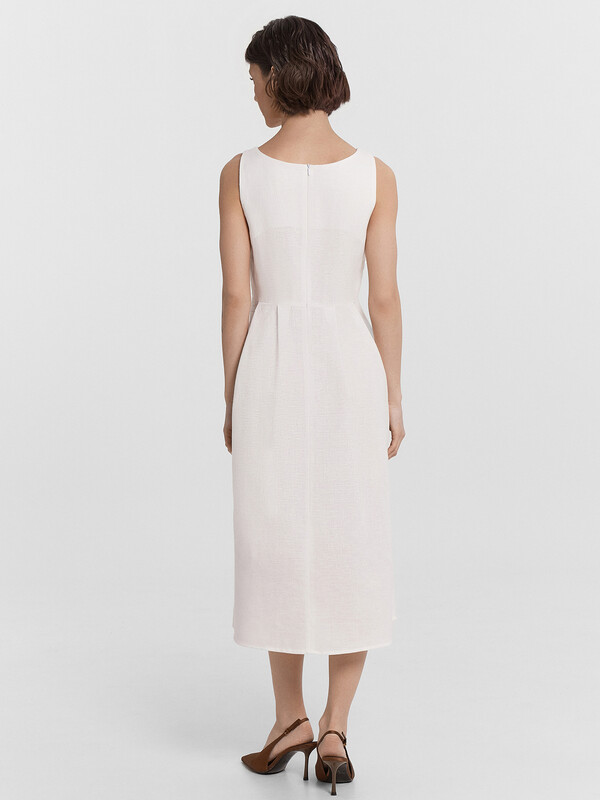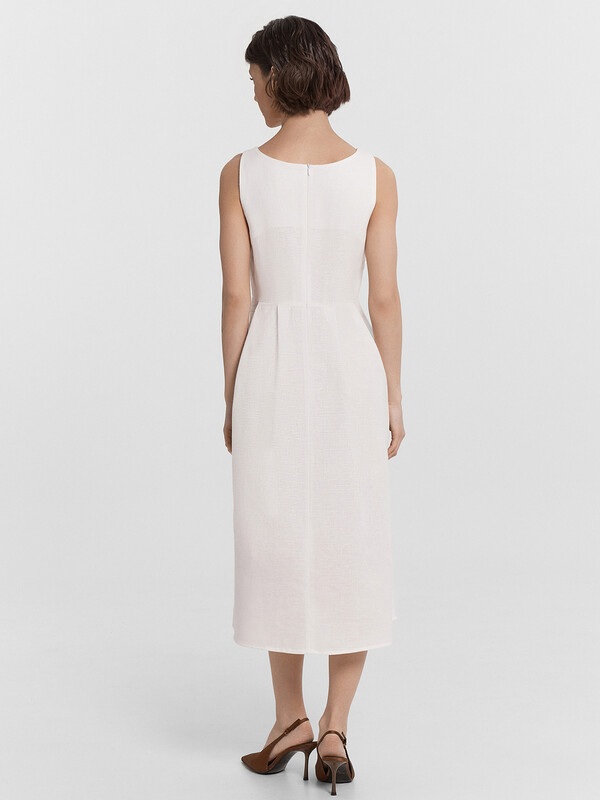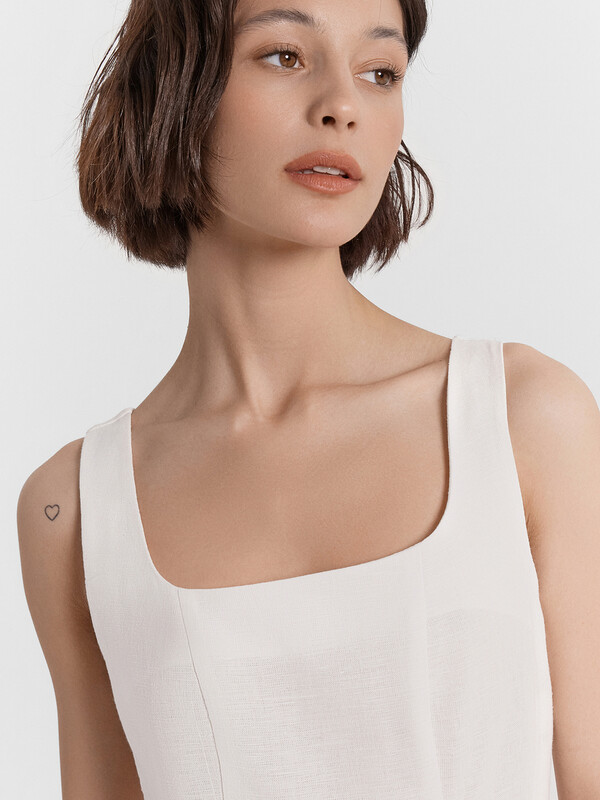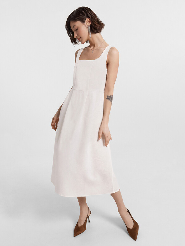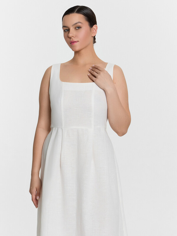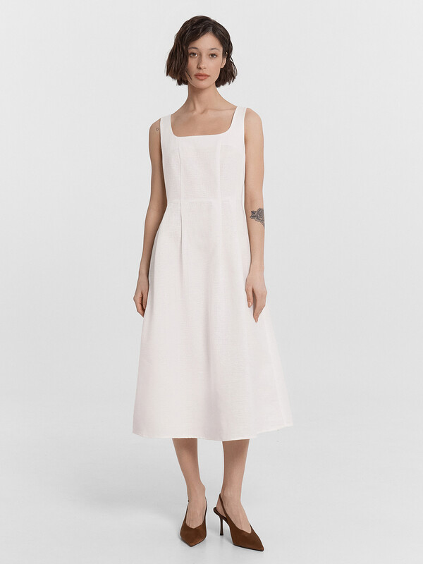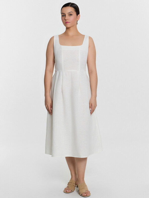 Стильный сарафан миди, выполненный из премиального льна и хлопка, станет прекрасным дополнением вашего гардероба. Модель на бретелях отличается слегка прилегающим силуэтом, который акцентирует внимание на талии, подчеркивая вашу фигуру. А вырез горловины каре и рельефные швы по передней части придают сарафану элегантный и изысканный вид. Застежка на потайную молнию на спинке обеспечивает удобство при надевании и снятии. Этот красивый и комфортный сарафан идеально подходит для теплого времени года, сочетая в себе стиль и комфорт. Отличный выбор для тех, кто ценит качество и элегантность в одежде!