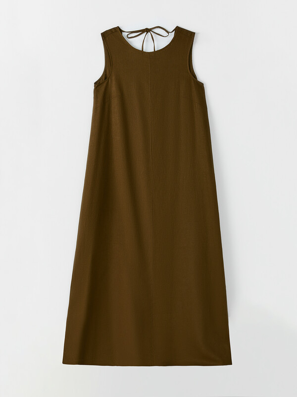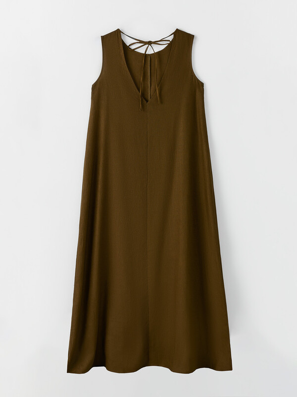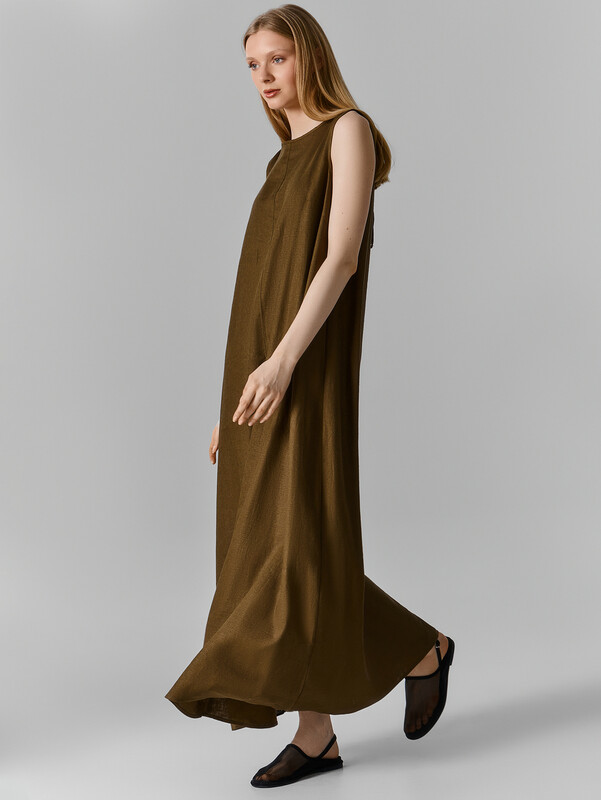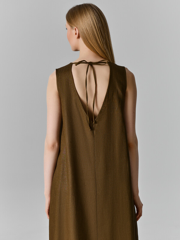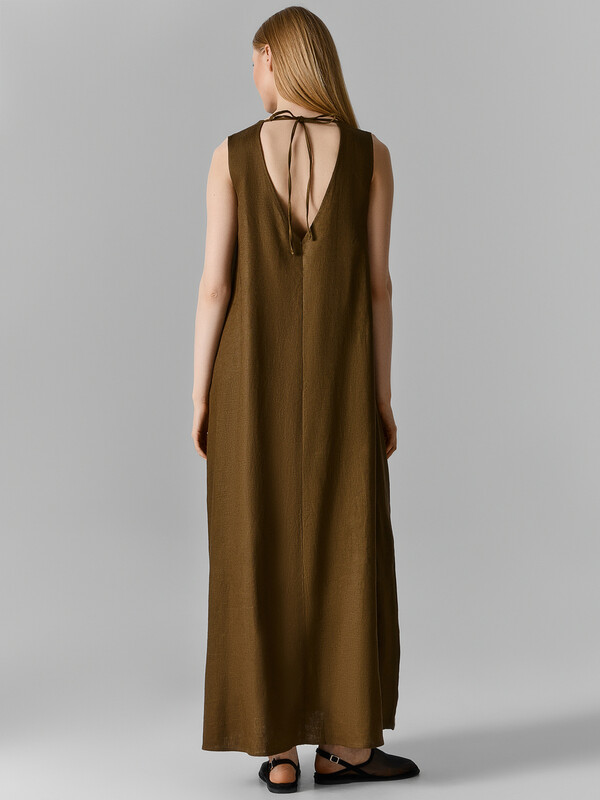 Сарафан А-силуэта, длиной макси. Горловина круглая широкая. По горловине спинки горловина глубокий V-образный вырез. Горловина обработана бейкой из основного полотна переходящей в завязки. Проймы и вырез по спинке обработан бейками в "чистый край". Перед и спинка с центральными швами. На передних половинках застрочены вытачки. Нижний срез сарафана обработан швом вподгибку с закрытым срезом.