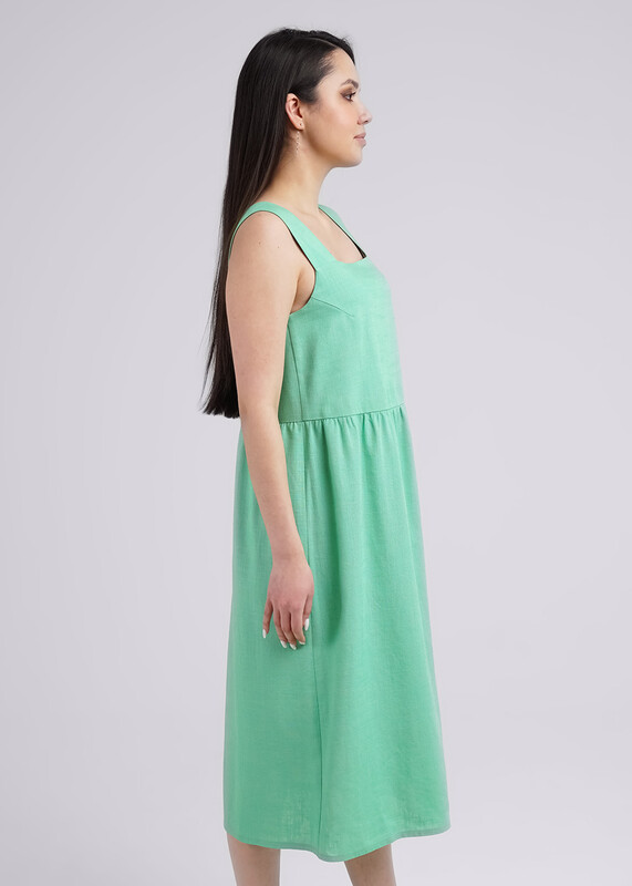 Сарафан из тканого полотна лен с вискозой,свободного кроя отрезной под линией груди со сборкой. Широкие бретели, квадратный вырез, длина миди.