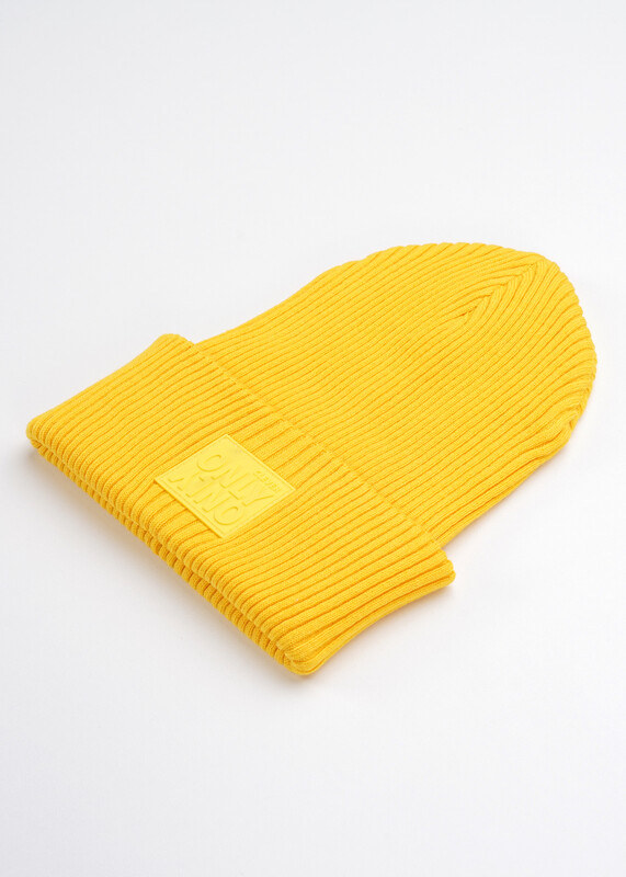 Стильная детская двойная шапка с отворотом, связаная ластичным переплетением, декорирована силиконовой нашивкой в центре.