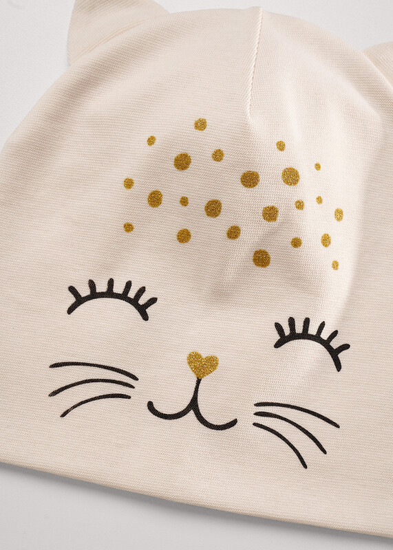 Шапка двойная без отворота, декорирована ушками и набивной принт-глиттер с эффектом блесток кошка. Хорошо защищает от ветра, что делает ее превосходным вариантом для весны. Размер 52-54