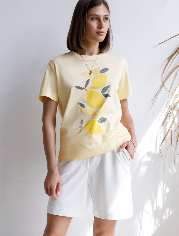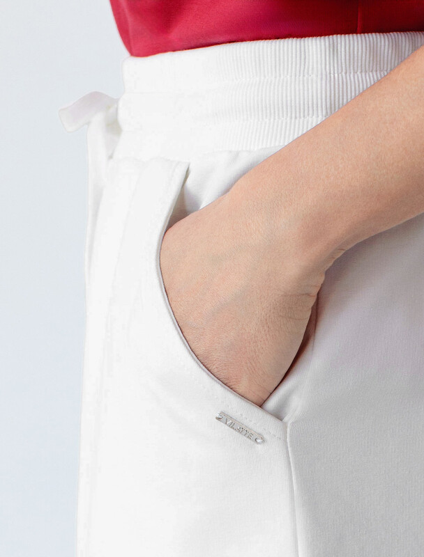 Шорты выполнены из футера двухнитки с эластаном. Модель прямого кроя дополнена боковыми карманами и одним задним карманом. Пояс выполнен из эластичного трикотажа в рубчик. В пояс вставлен плоский хлопковый шнур в тон изделия с серебристыми наконечниками. Изделие дополнено металлическим логотипом бренда. Сочетается в костюме с жакетом D49.078, джемпером D49.079, D49.080 и футболкой D49.081