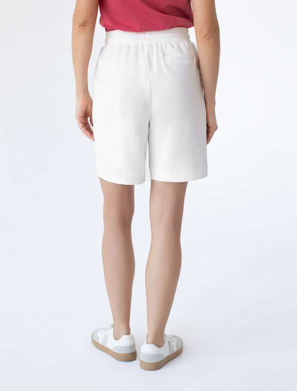 Шорты выполнены из футера двухнитки с эластаном. Модель прямого кроя дополнена боковыми карманами и одним задним карманом.  Пояс выполнен из эластичного трикотажа в рубчик. В пояс вставлен плоский хлопковый шнур в тон изделия с серебристыми наконечниками. Изделие дополнено металлическим логотипом бренда. Сочетается в костюме с жакетом D49.078, джемпером D49.079, D49.080 и футболкой D49.081