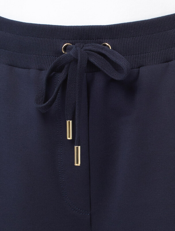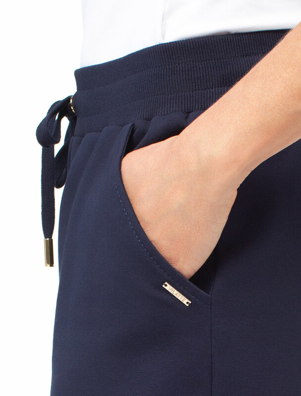 Шорты выполнены из футера двухнитки с эластаном. Модель прямого кроя дополнена боковыми карманами и одним задним карманом. Пояс выполнен из эластичного трикотажа в рубчик. В пояс вставлен плоский хлопковый шнур в тон изделия с серебристыми наконечниками. Изделие дополнено металлическим логотипом бренда. Сочетается в костюме с жакетом D49.078, джемпером D49.079, D49.080 и футболкой D49.081
