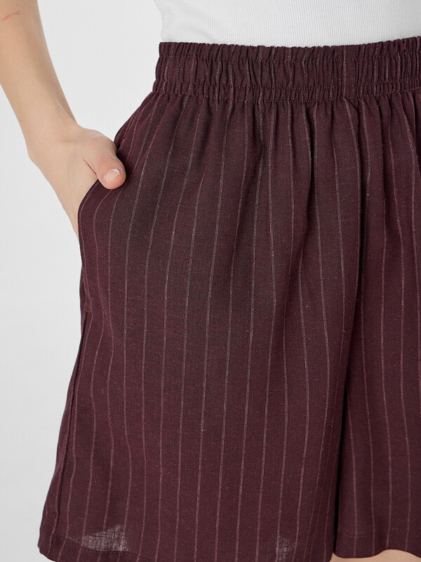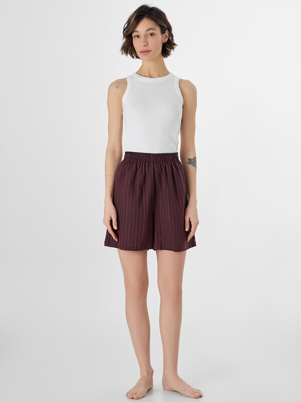 Шорты изготовлены из льна и вискозы. Этот состав объединяет натуральную прохладу и воздухопроницаемость льна с мягкостью и гладкостью вискозы, обеспечивая комфорт в теплую погоду. Классическая коричневая полоска делает шорты стильным и универсальным элементом домашнего гардероба.