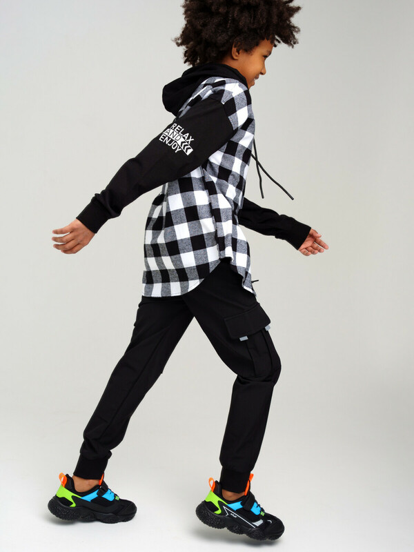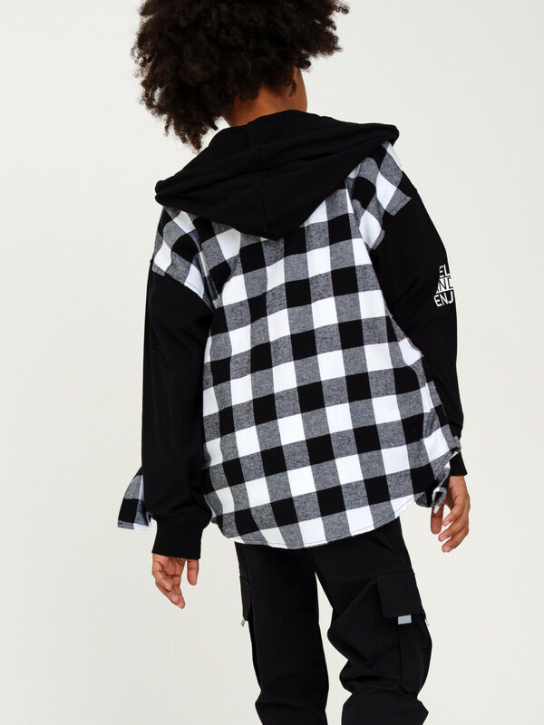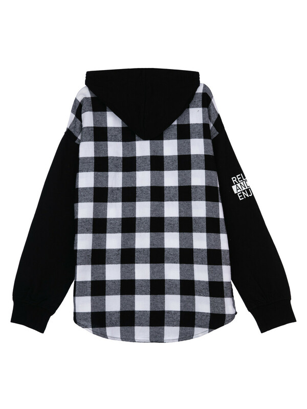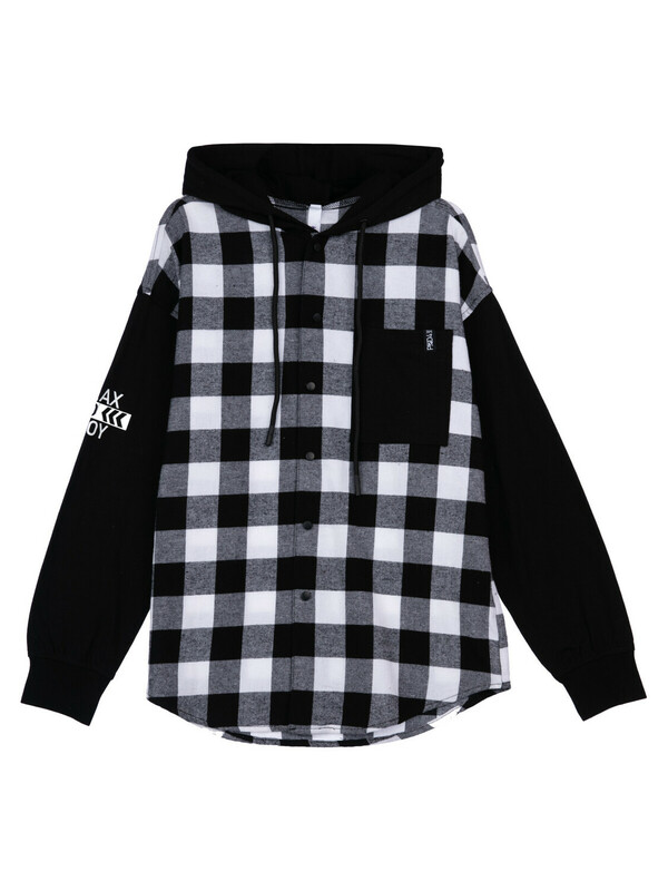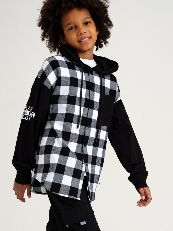 Рубашка в клетку. Комбинированная ткань. Тело из фланели, рукава и капюшон из трикотажа. Высокое содержание хлопка. Comfort fit – свободный силуэт. На полочке карман.