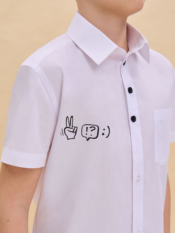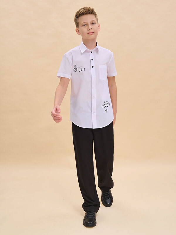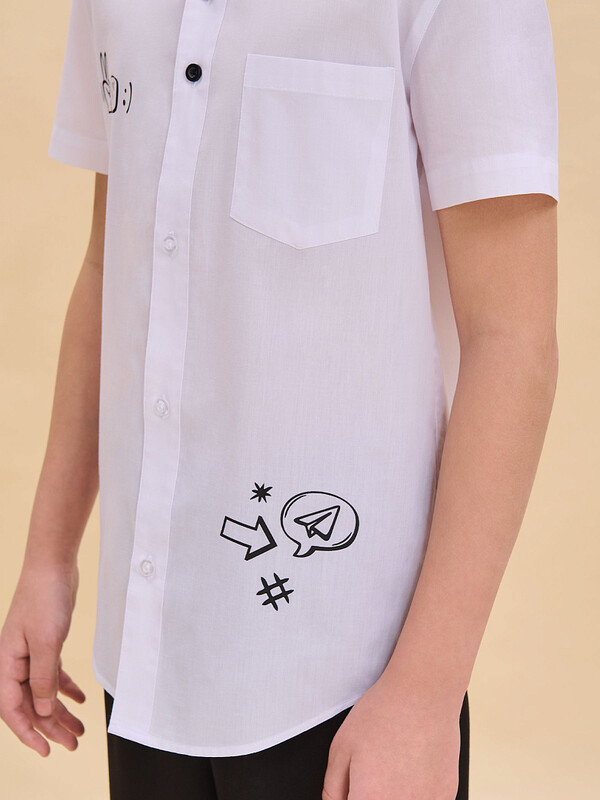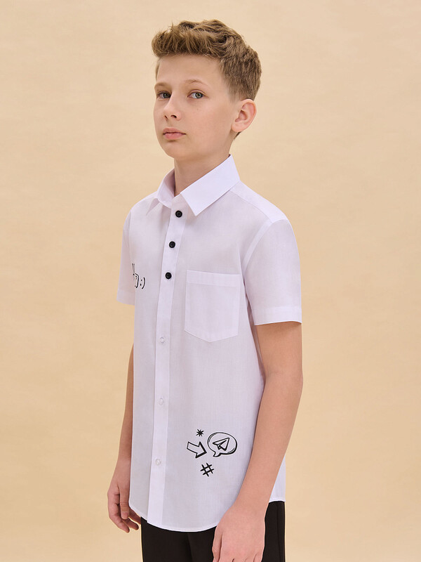 Школьная рубашка для мальчика прямого силуэта подойдет для разных типов фигур. Выдержит любую активность подростка. Ткань мало мнется, хорошо держит форму, а загрязнения легко отстирываются. Дизайн рубашки позволит выделяться и быть модным не только в школе. Заметные акценты- разноцветные пуговицы на планке и принты в стиле инфографики позволяют чувствовать себя стильным и современным.