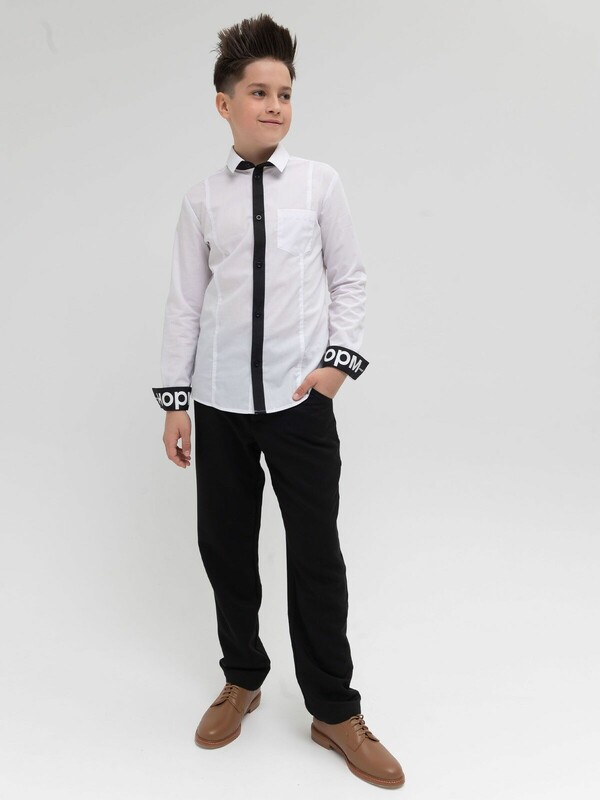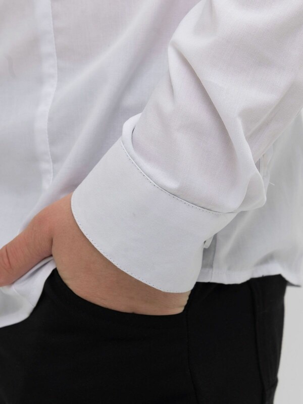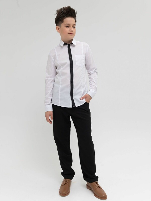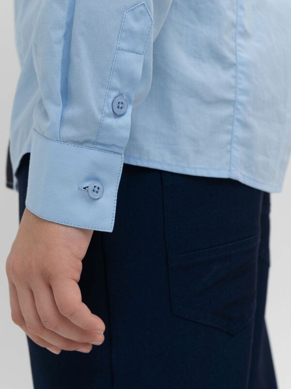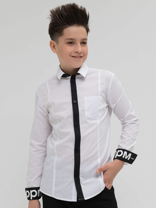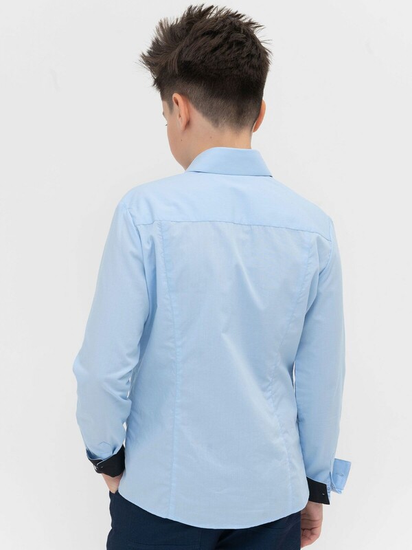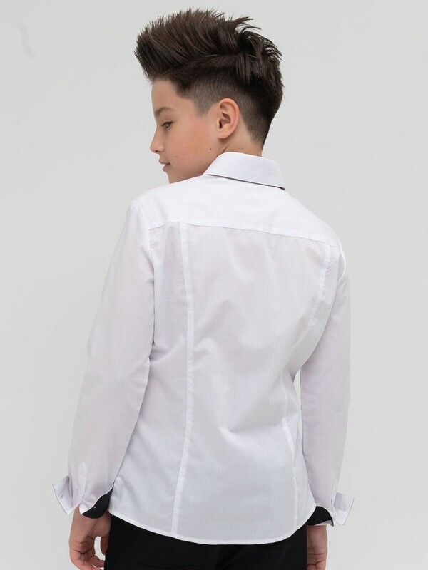 Школьная рубашка для мальчика из практичной ткани с современными деталями. Самые уязвимые для грязи детали выполнены из ткани контрастного цвета. Это разбавляет официальный стиль и позволяет не стирать белую рубашку каждый день.
