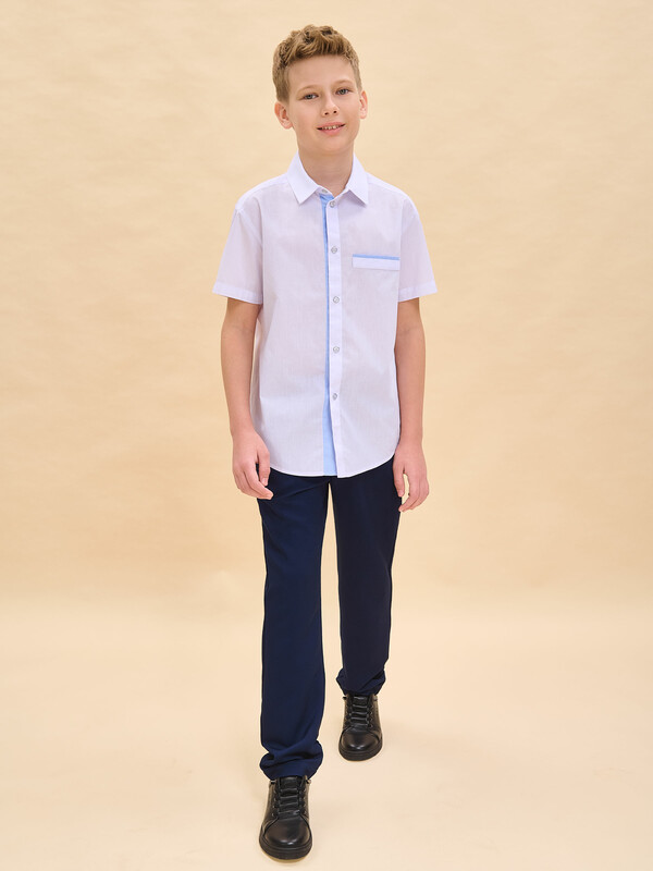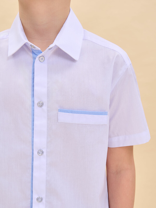 Школьная рубашка прямого силуэта для мальчика. Рубашка детская с классической центральной застёжкой на кнопки, имитирующие пуговицы — ребёнок легко и быстро застегнёт и расстегнёт. На груди имитация прорезного кармана. Вдоль планки и на кармане контрастный кант — яркая деталь, выгодно отличающая эту модель от банальных однотонных рубашек. В составе ткани преобладает качественный хлопок — рубашка для мальчика мягкая, воздухопроницаемая и комфортная для ребёнка. Полиэстер помогает изделию не терять форму и отличный внешний вид — рубашка прослужит не один сезон. Сорочка детская лаконичного дизайна, без принта, её легко сочетать с различными брюками, пиджаками, жилетами. Красивая и практичная рубашка в школу для мальчика — подходит как для повседневной носки, так и для более торжественных случаев. Рекомендуемый уход: стирать при температуре не выше 30 °С, без предварительного замачивания, с изнанки, расправить перед сушкой. Выбирайте нужный размер по таблице размеров на фото. Цвет товара на экране вашего устройства может отличаться от цвета изделия вживую.