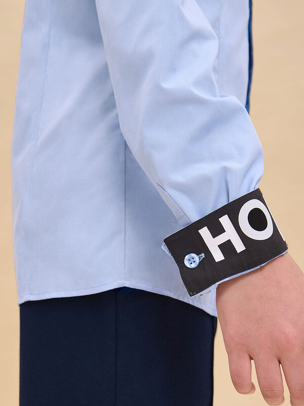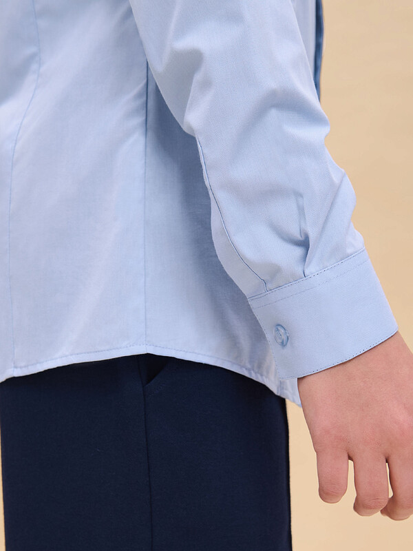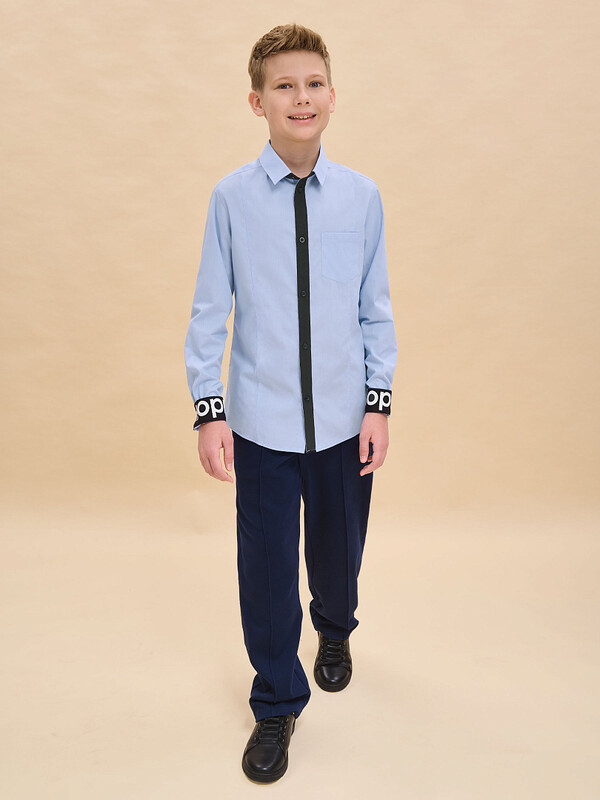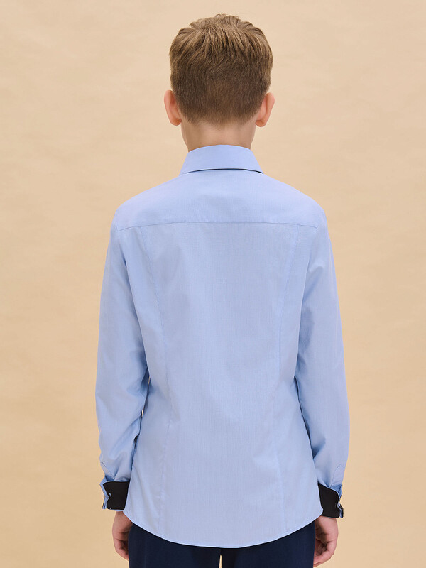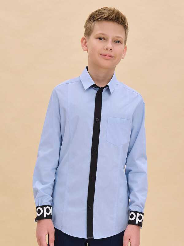 Школьная рубашка для мальчика из практичной ткани с современными деталями. Самые уязвимые для грязи детали выполнены из ткани контрастного цвета. Это разбавляет официальный стиль и позволяет не стирать белую рубашку каждый день.
