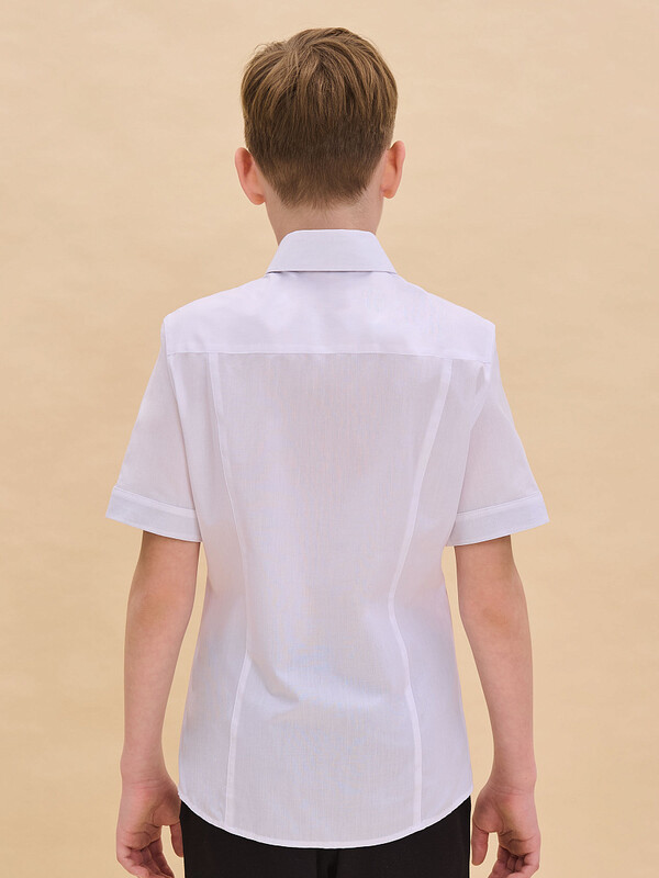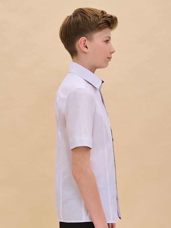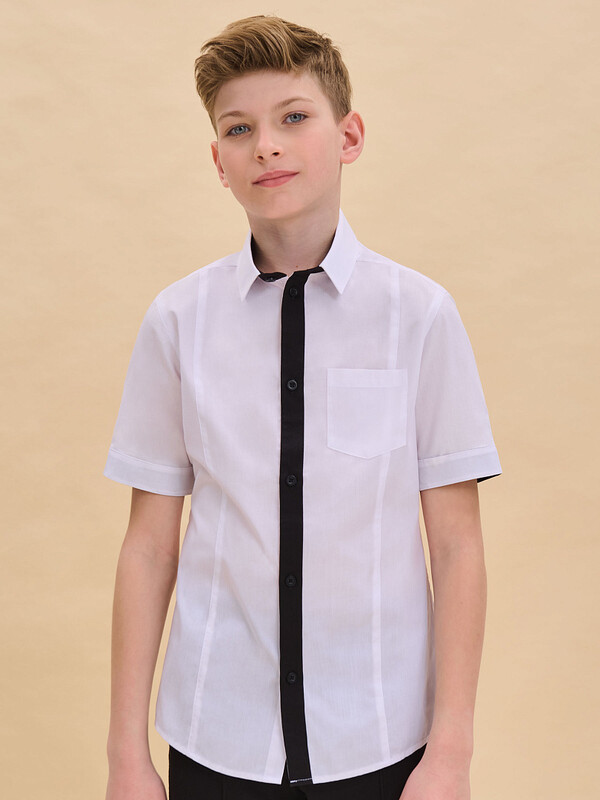 Школьная рубашка для мальчика из практичной ткани с современными деталями. Самые уязвимые для грязи детали выполнены из ткани контрастного цвета. Это разбавляет официальный стиль и позволяет не стирать белую рубашку каждый день.