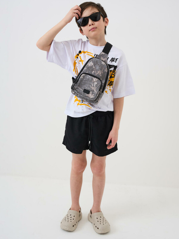 Трендовая сумка кросс-боди для мальчика-подростка. Регулируемый брендированный ремень. Основной отсек на молнии, спереди дополнительный карман на молнии, сзади карман для транспортной карты. Внутри есть карман на молнии. Параметры: высота - 18 см, ширина -13 см, глубина - 6 см.