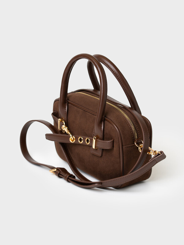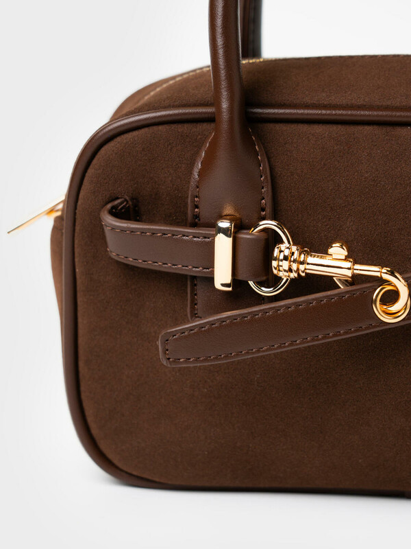 Небольшая сумка трендовой формы выполнена из искусственной замши с отделкой из искусственной кожи. Сумка имеет две ручки и плечевой регулируемый ремень. Ее можно носить как в руках, так и как кросс-боди. Сумка имеет одно отделение. Внутри имеется небольшой карман на молнии. Параметры сумки: ширина - 24см, высота - 9 см, глубина - 13 см