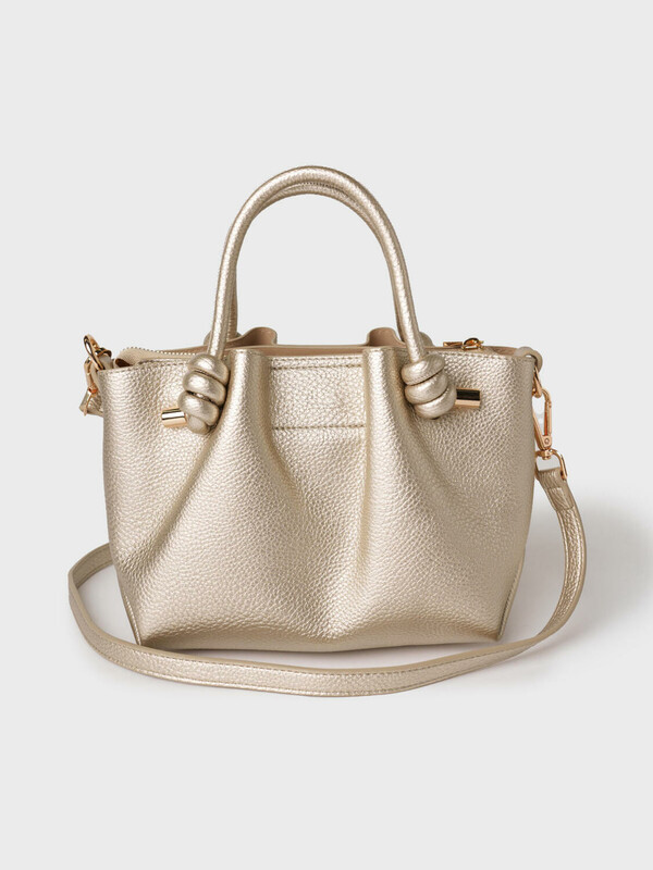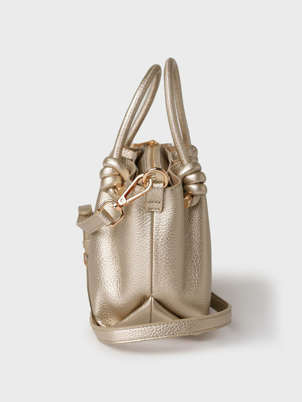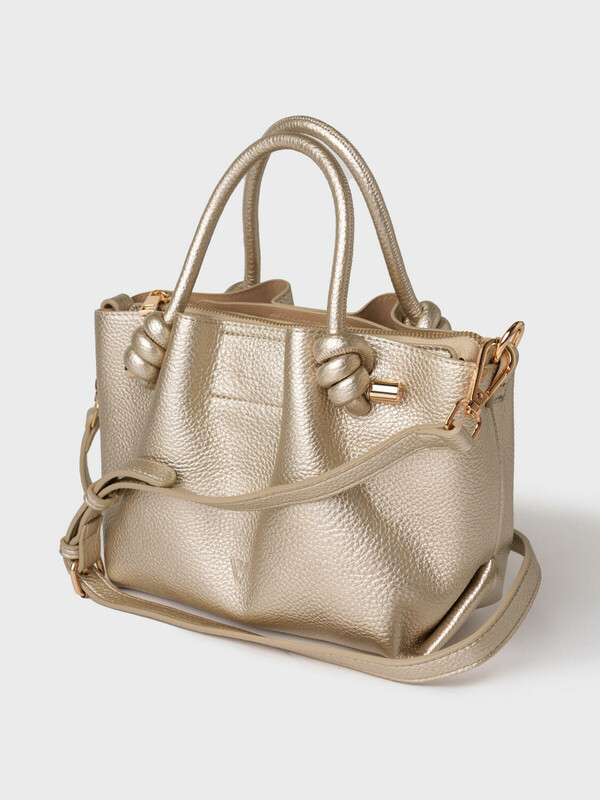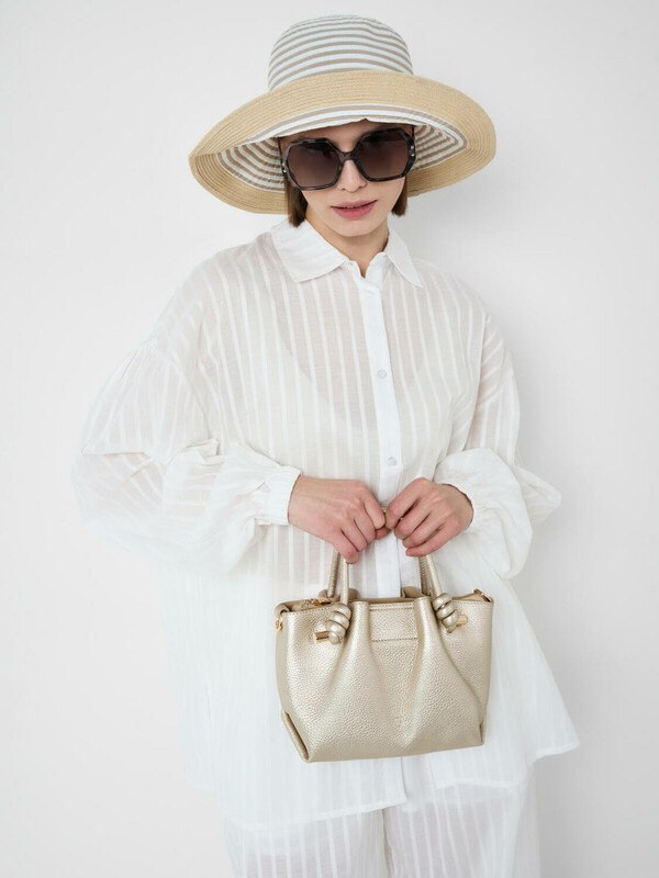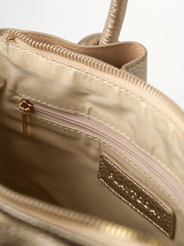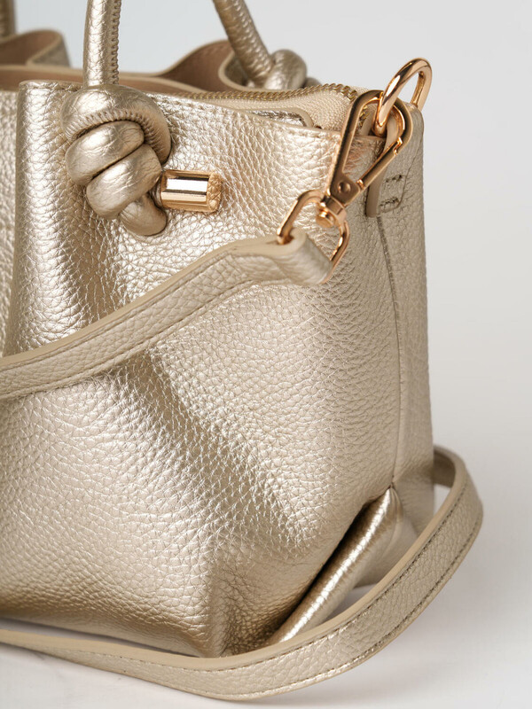 Небольшая женская сумка кросс-боди. Сумка выполнена из мягкой тисненной кожи благородного золотого цвета. Сумка имеет одно основное отделение на молнии и два дополнительных отделения на кнопках. Внутри есть два кармана, один из них на молнии. Сумка имеет регулируемый плечевой ремень. Параметры сумки: высота - 18 см, ширина - 23 см, глубина - 11 см. В подарок идет брендированный пыльник.