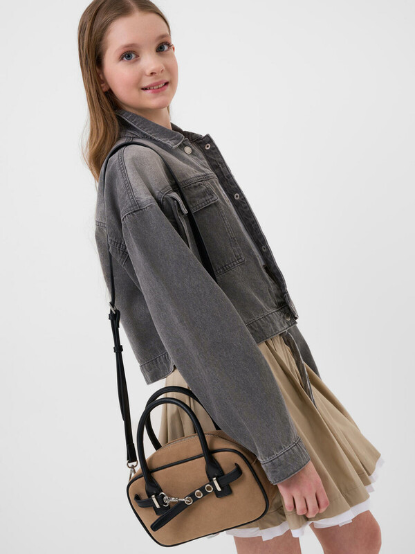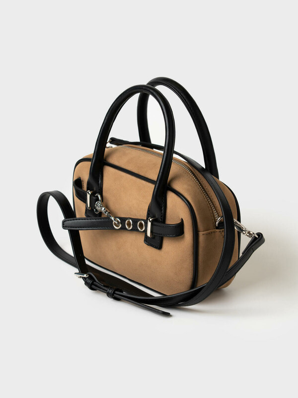Небольшая сумка трендовой формы выполнена из искусственной замши с отделкой из искусственной кожи. Сумка имеет две ручки и плечевой регулируемый ремень. Ее можно носить как в руках, так и как кросс-боди. Сумка имеет одно отделение. Внутри имеется небольшой карман на молнии. Параметры сумки: ширина - 24см, высота - 9 см, глубина - 13 см