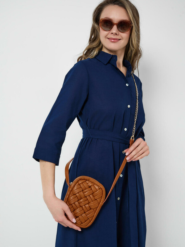Небольшая элегантная сумка кросс-боди вытянутой формы. Сумка выполнена из плетеной искусственной кожи. Сумка имеет плечевой ремень, состоящий из цепочки и кожаной детали на плече, поэтому ремень не будет сползать с плеча. Сумка имеет одно отделение на молнии. Внутри имеется небольшой карман для телефона. Параметры сумки: ширина - 12см, высота - 18 см, глубина - 5 см