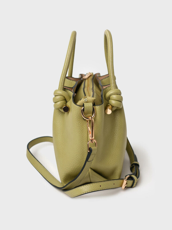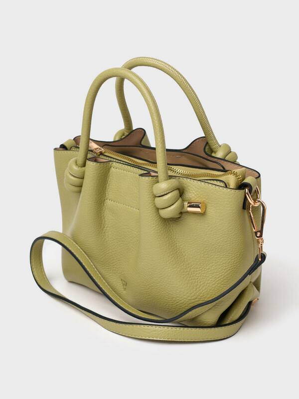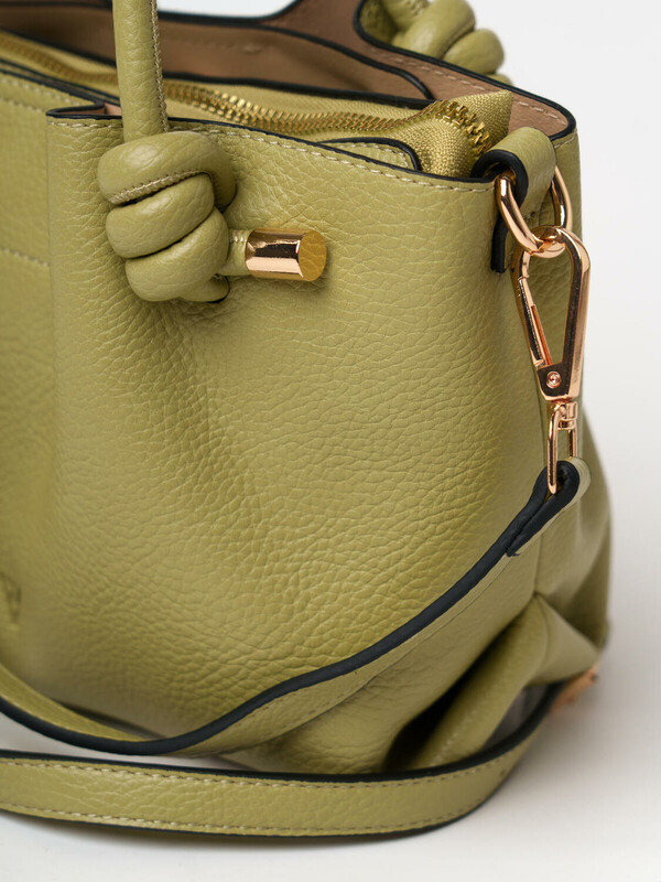 Небольшая женская сумка кросс-боди. Сумка выполнена из мягкой тисненной кожи оливкового цвета. Сумка имеет одно основное отделение на молнии и два дополнительных отделения на кнопках. Внутри есть два кармана, один из них на молнии. Сумка имеет регулируемый плечевой ремень. Параметры сумки: высота - 18 см, ширина - 23 см, глубина - 11 см. В подарок идет брендированный пыльник.