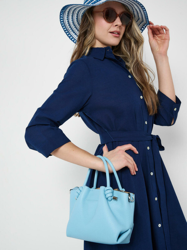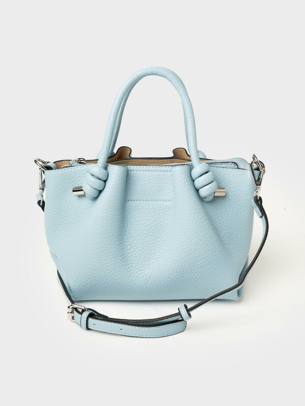 Небольшая женская сумка кросс-боди. Сумка выполнена из мягкой тисненной кожи трендового голубого цвета. Сумка имеет одно основное отделение на молнии и два дополнительных отделения на кнопках. Внутри есть два кармана, один из них на молнии. Сумка имеет регулируемый плечевой ремень. Параметры сумки: высота - 18 см, ширина - 23 см, глубина - 11 см. В подарок идет брендированный пыльник.