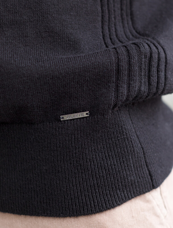 Свитер тонкой вязки выполнен из хлопка с добавлением кашемира. Лаконичная модель дополнена декоративными швами и металлическим логотипом бренда. Мягкая и очень приятная пряжа совершенно не колется, сохраняет тепло при этом не перегревая, гарантируя безупречный комфорт.