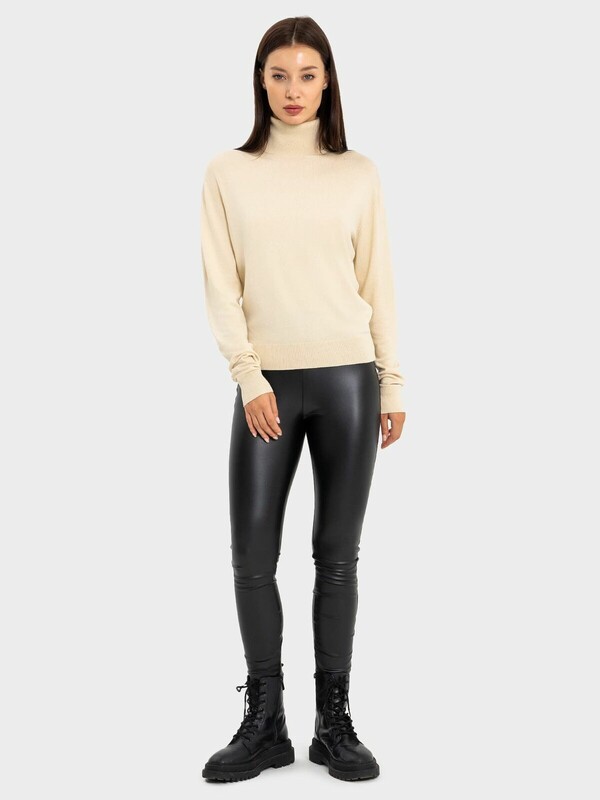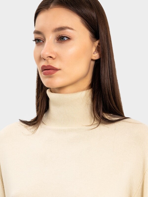 Свободный женский свитер из натурального дышащего хлопка и полиакрилонитрила – гипоаллергенного, легкого, термостойкого и долговечного материала. Длина до середины бедра или чуть ниже. Рукава длинные. Широкий воротник-стойка. Стильный свитер!