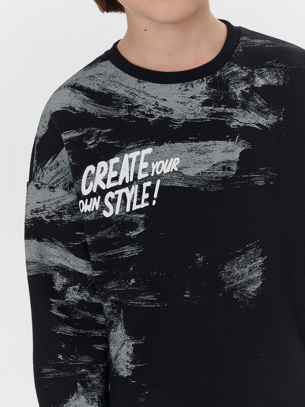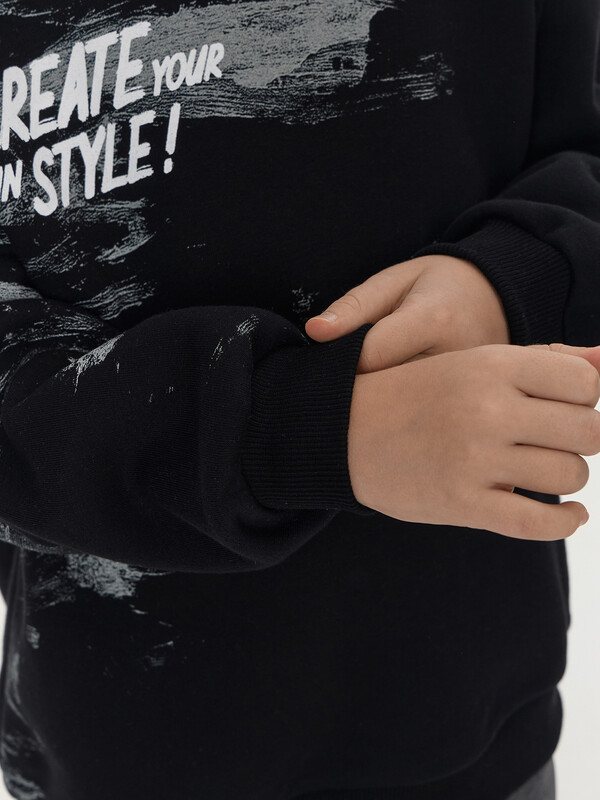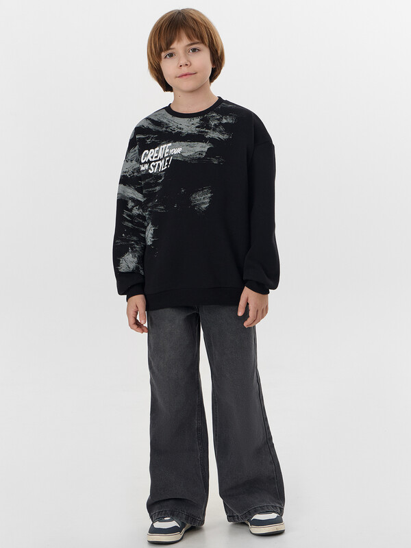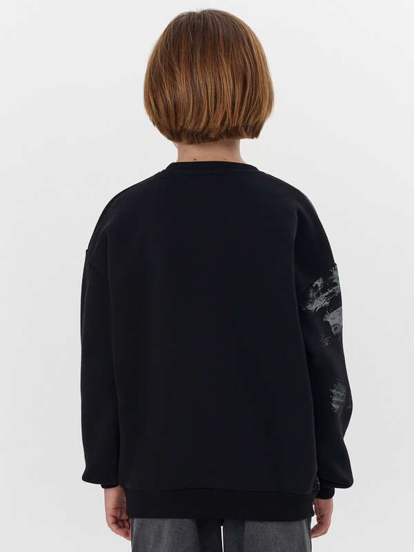 Свитшот для мальчиков, свободного силуэта. Горловина округлой формы, из рибаны. Шов втачивания закрыт хб тесьмой. Плечо спущено, рукав втачной длинный. На рукавах манжеты из рибаны. Пояс отрезной из рибаны.