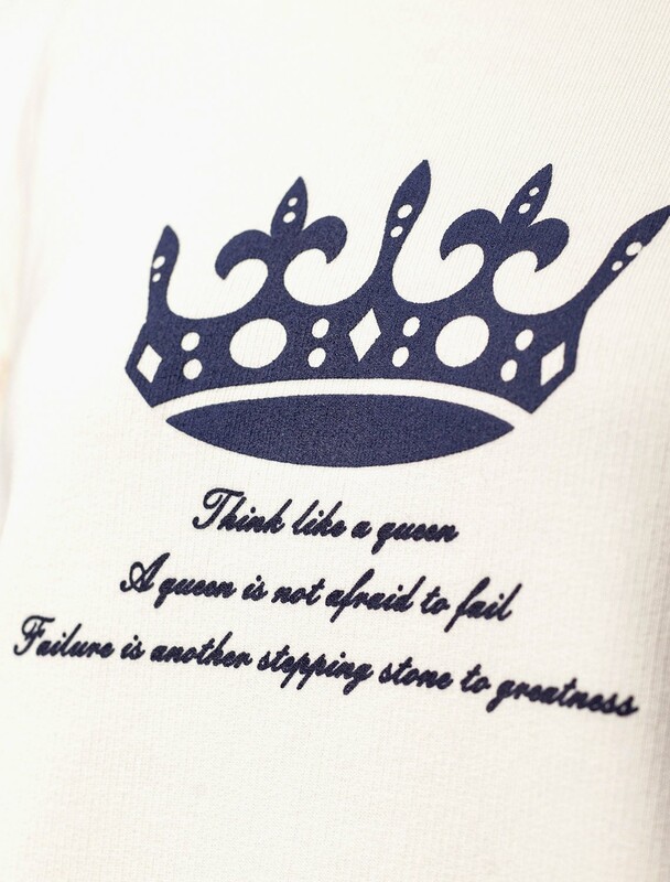Свитшот выполнен из премиального футера трехнитки петля. Лаконичный принт выполнен красками с устойчивым покрытием: Перевод: Think like a queen, a queen is not afraid to fail, failure is another stepping stone to greatness: Смотри на мир, как королева - королева не боится ошибок, ведь ошибка - это еще один шаг к величию» Наличие эластана в составе гарантирует комфорт, формоустойчивость и долговечность изделия.