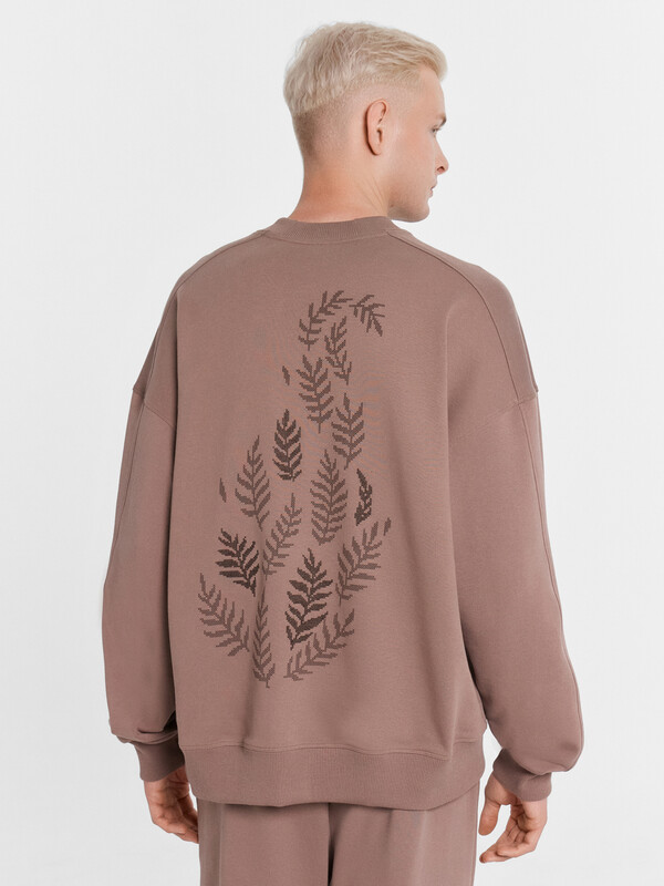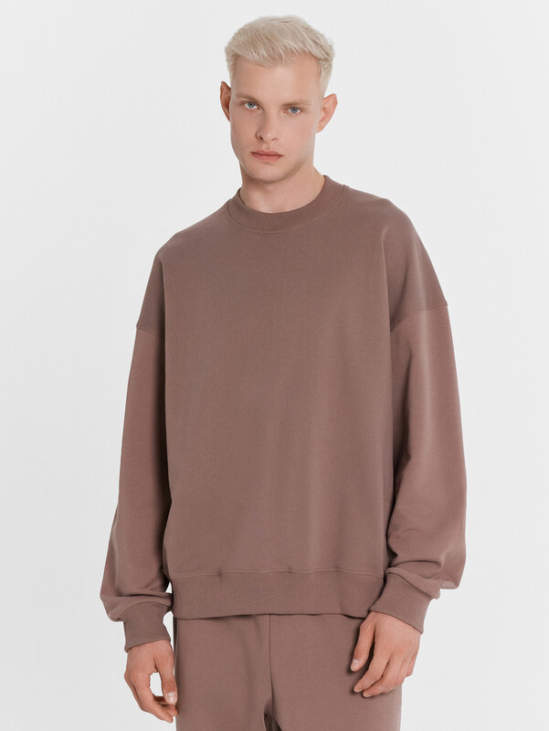 Свитшот свободного силуэта. Горловина округлой формы, обработана обтачкой из рибаны. Шов втачивания обтачки по спинке закрыт тесьмой. Рукава втачные длинные, 2х шовные. С отрезными манжетами из рибаны. Линия плеча спущена. Плечевые швы смещены в сторону спинки и переходят в локтевой шов рукава. По низу отрезной пояс из рибаны.
