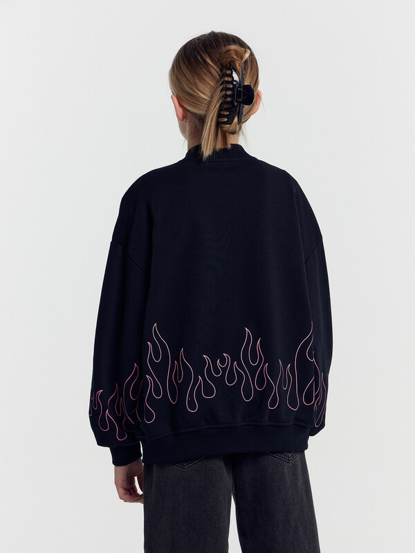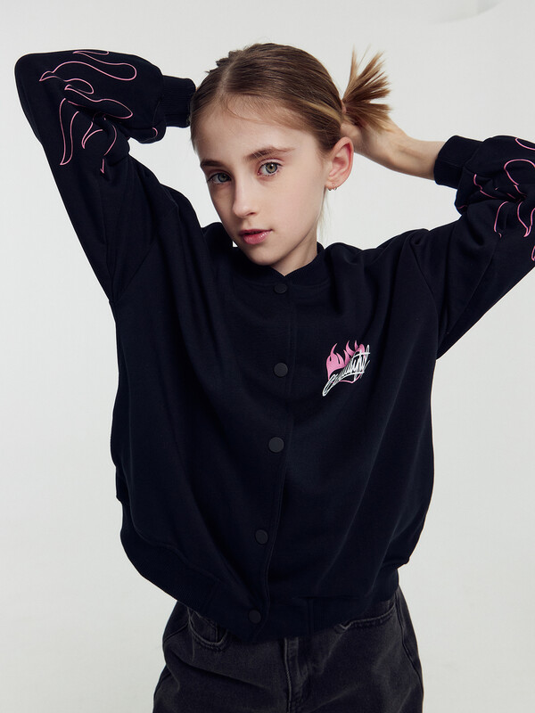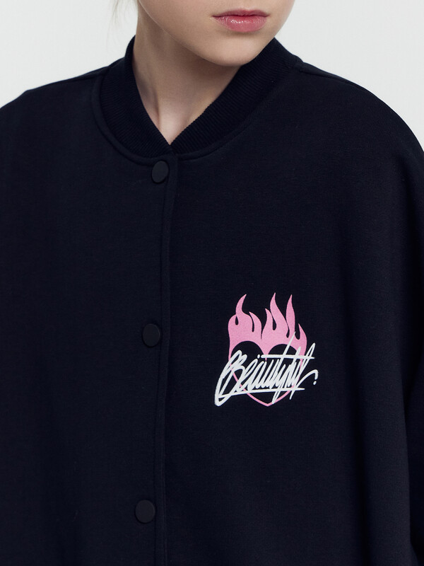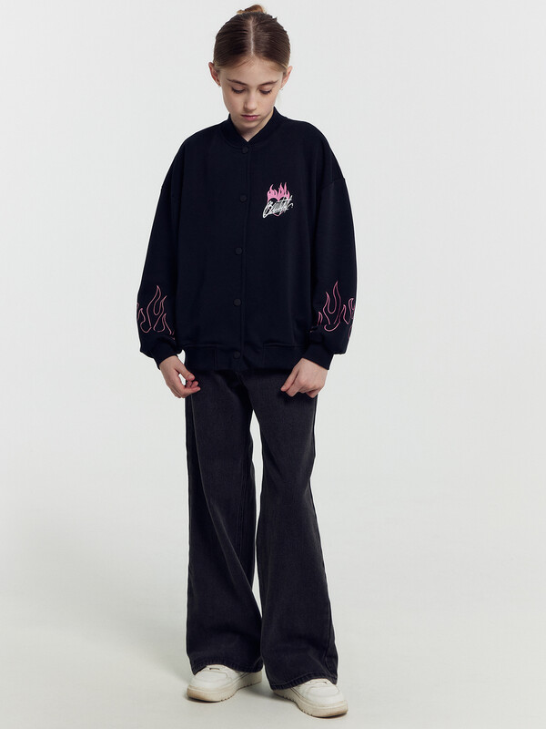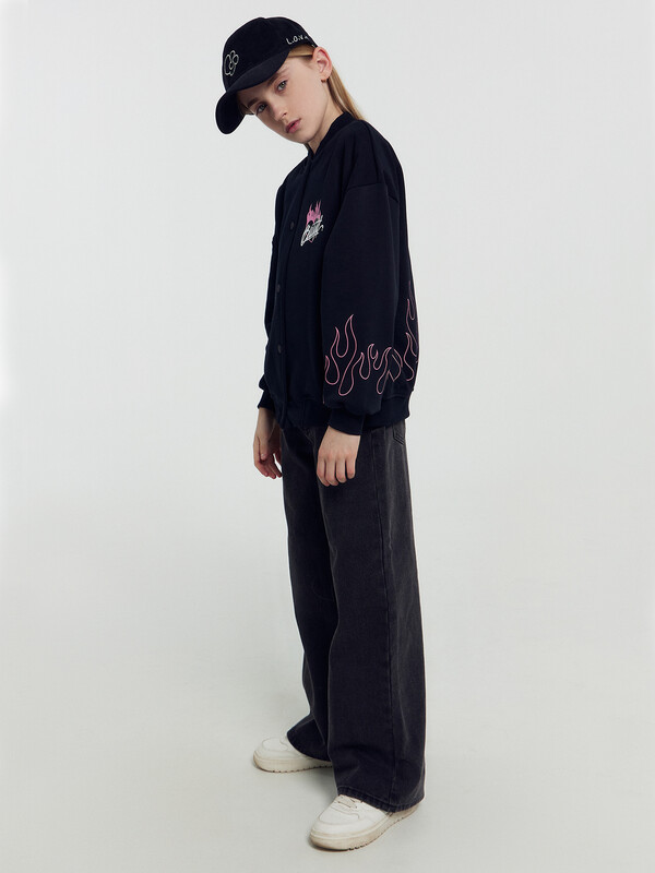 Жакет свободного кроя. Боковые швы к низу перенесены вперед. Круглый вырез горловины. В горловину втачан воротник-стойка из рибаны. Плечо спущено, пройма углубленна. Рукава втачные, длинные. По низу рукавов манжеты из рибаны. В боковых швах карманы . По низу изделия отрезной пояс из рибаны.
