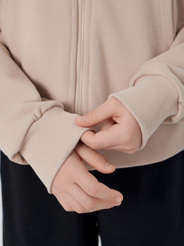 манжеты по низу рукавов и притачной пояс из рибаны. По переду застежка молния, карман кенгуру.