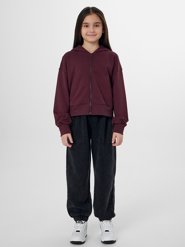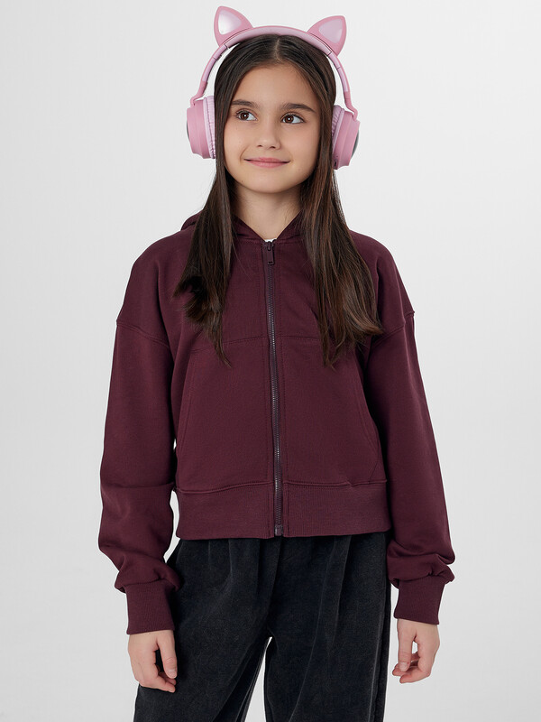 Толстовка на молнии с капюшоном для девочек станет любимой вещью в гардеробе для активного отдыха и повседневной носки. Удобная застежка-молния и практичный карман-кенгуру позволяют легко надевать изделие и хранить в нем нужные мелочи. Длинные рукава с мягкими манжетами и спущенная линия плеча обеспечивают комфорт и свободу движений.