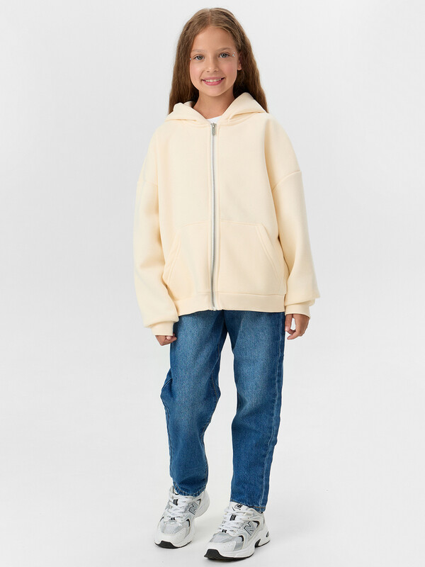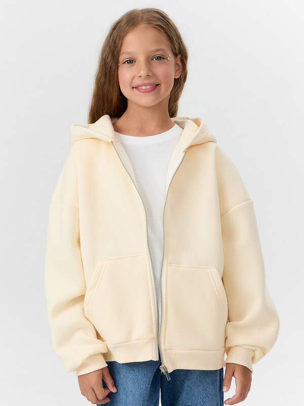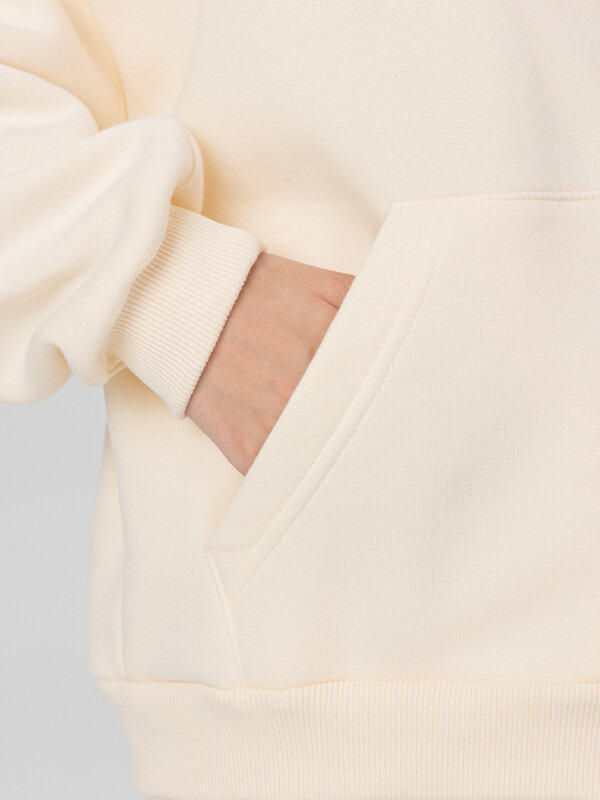 Рукава втачные длинные, плечо спущено. По низу рукава отрезная манжета из рибаны. Центральная застежка на тесьму молнию. По переду накладные карманы кенгуру.