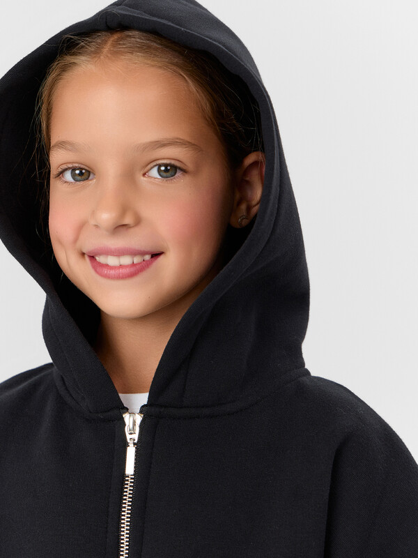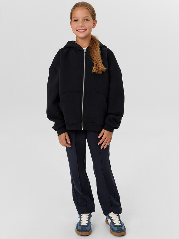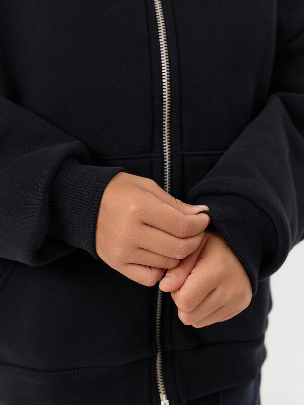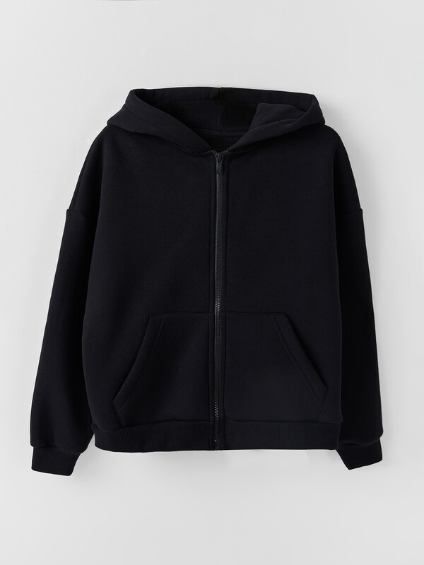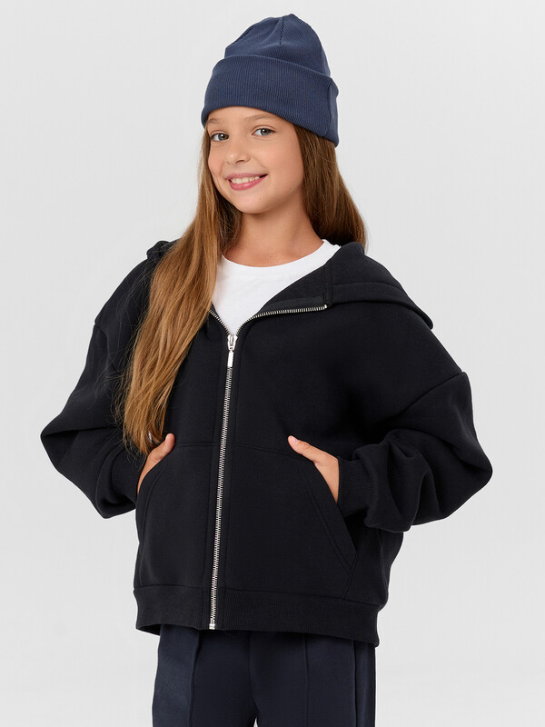 Рукава втачные длинные, плечо спущено. По низу рукава отрезная манжета из рибаны. Центральная застежка на тесьму молнию. По переду накладные карманы кенгуру.