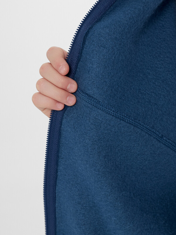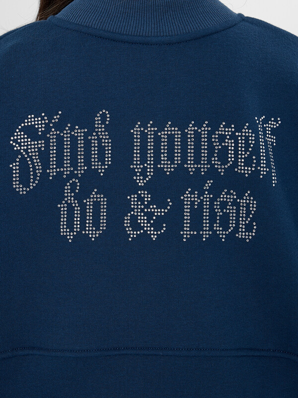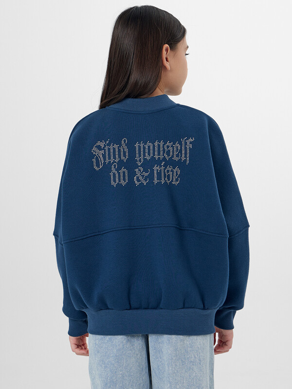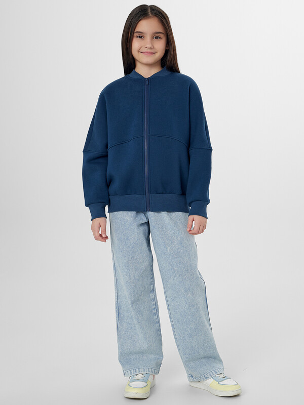 Толстовка свободного силуэта. Круглый вырез горловины. В горловину втачен воротник-стойка из рибаны. Рукава втачные, длинные. По низу рукава манжеты из рибаны. По переду застежка на молнию. По переду и спинки декоративные членения. По низу изделия отрезной пояс из рибаны.